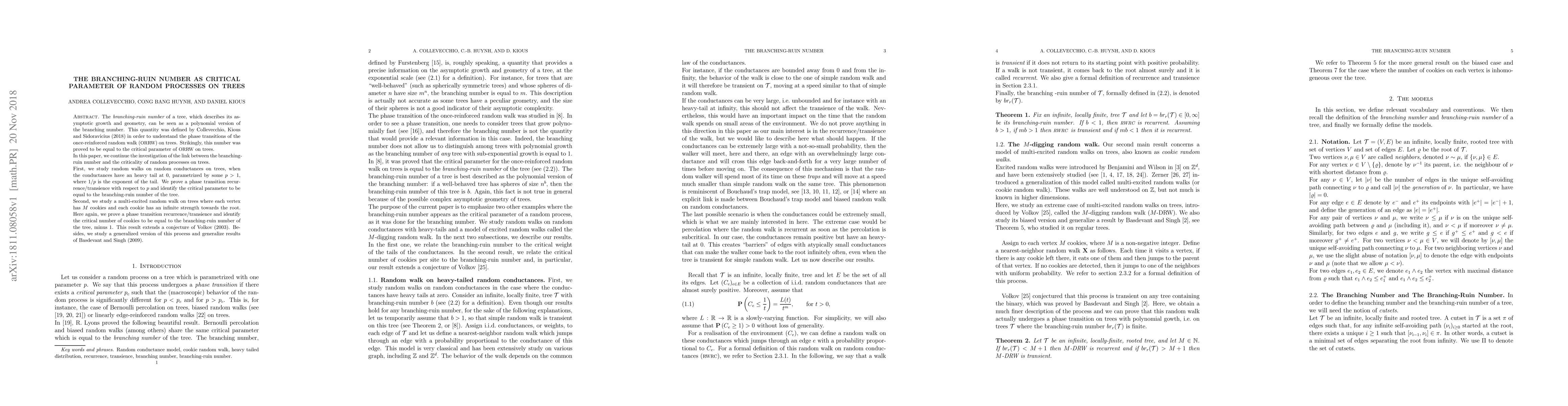 This paper investigates the branching-ruin number as a critical parameter for random processes on trees, proving its role in determining the recurrence/transience of random walks on random conductances and multi-excited random walks. The critical parameter for these processes is shown to be the branching-ruin number, extending previous results and conjectures.