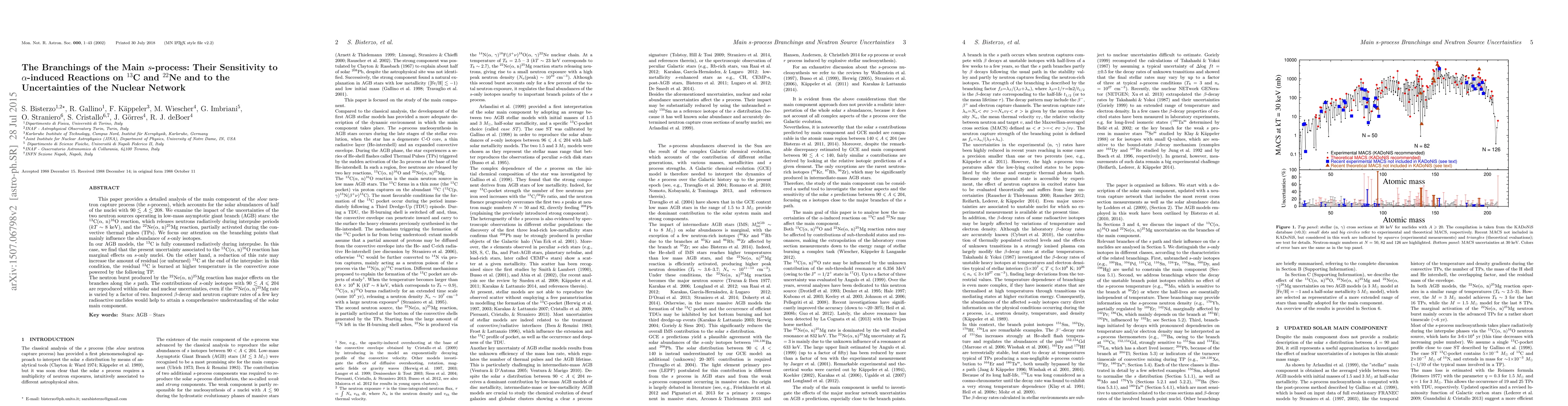 This paper analyzes the main s-process in low-mass AGB stars, focusing on the impact of alpha-induced reactions on 13C and 22Ne. It finds that while the 13C(alpha, n)16O reaction has minimal effects, the 22Ne(alpha, n)25Mg reaction significantly influences s-process branching points, especially for isotopes with atomic mass 90 <~ A <= 204.
