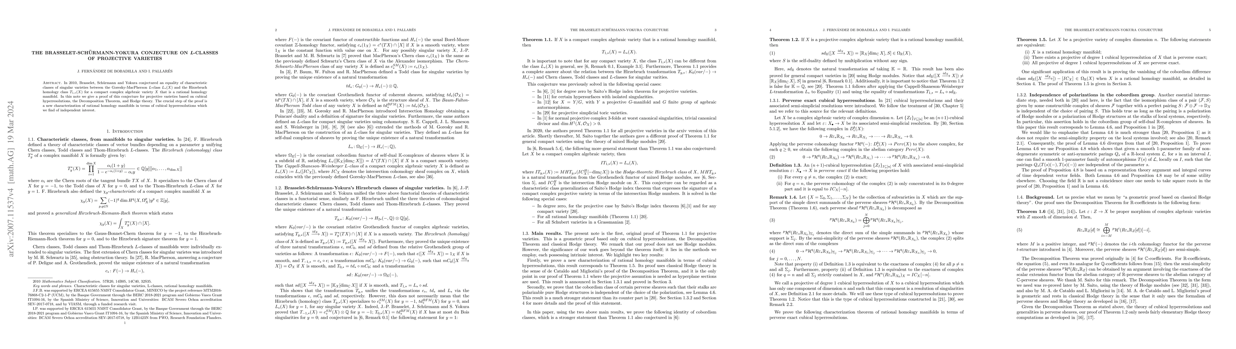 The Brasselet-Schürmann-Yokura conjecture posits an equality between the Goresky-MacPherson $L$-class and the Hirzebruch homology class for singular varieties. This paper proves the conjecture for projective varieties using cubical hyperresolutions, the Decomposition Theorem, and Hodge theory.