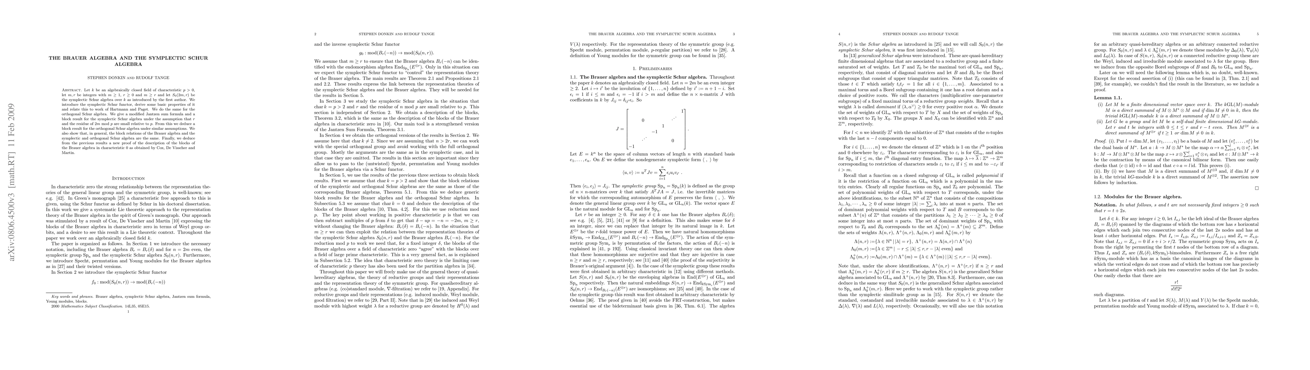 Let k be an algebraically closed field of characteristic p>0, let m,r be integers with m\ge1, r\ge0 and m\ge r and let S_0(2m,r) be the symplectic Schur algebra over k as introduced by the first author. We introduce the symplectic Schur functor, derive some basic properties of it and relate this to work of Hartmann and Paget. We do the same for the orthogonal Schur algebra. We give a modified Jantzen sum formula and a block result for the symplectic Schur algebra under the assumption that r and the residue of 2m mod p are small relative to p. From this we deduce a block result for the orthogonal Schur algebra under similar assumptions. Finally, we deduce from the previous results a new proof of the geometric description of the blocks of the Brauer algebra in characteristic 0 as obtained by Cox, De Visscher and Martin.