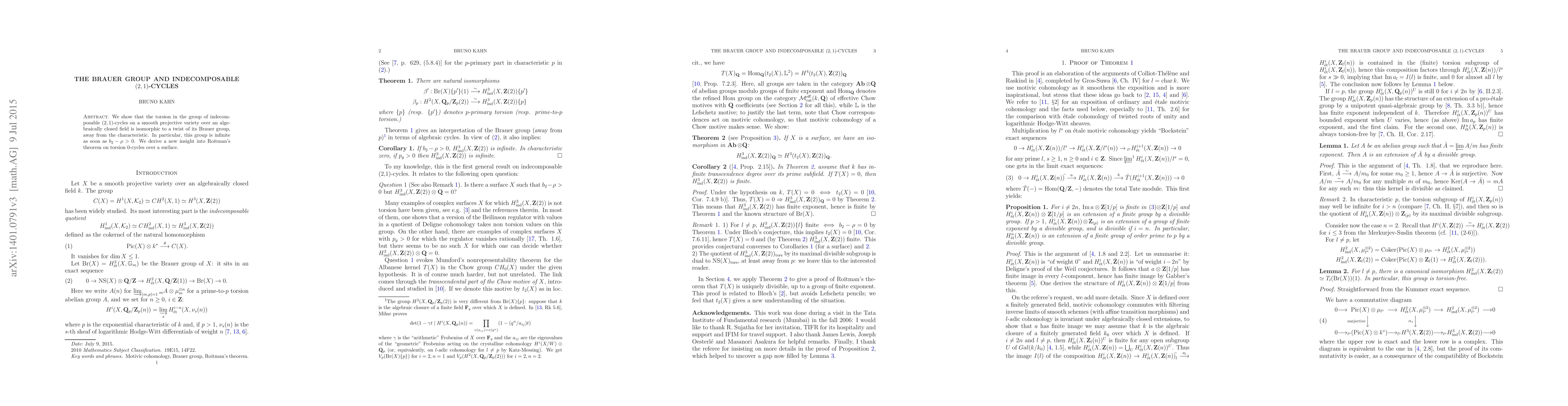 The paper shows that the torsion in indecomposable (2,1)-cycles on a smooth projective variety is related to its Brauer group, with implications for Roitman's theorem on 0-cycles over surfaces.