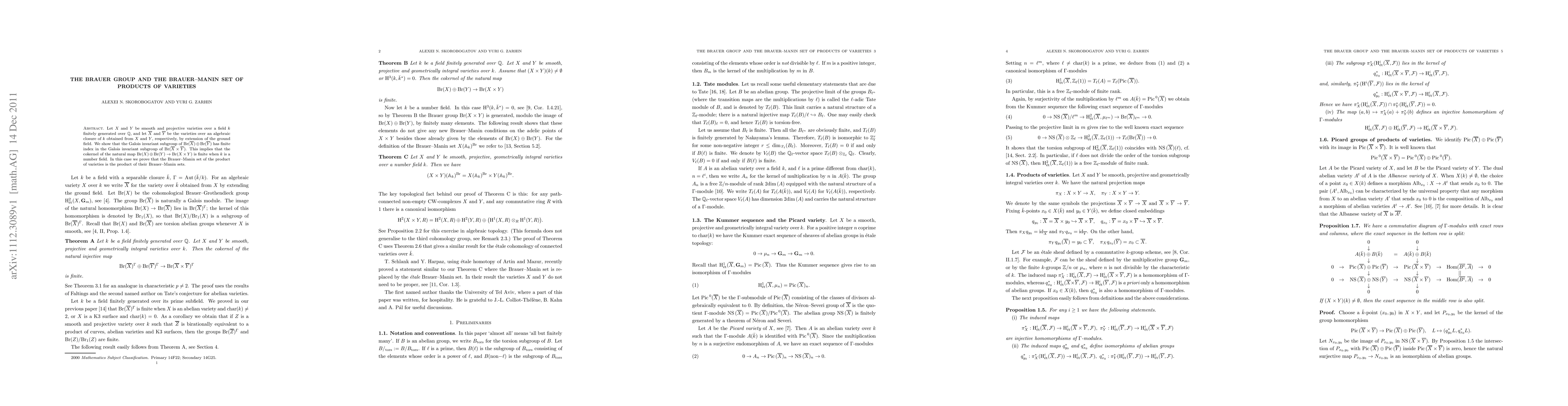 This research demonstrates that for smooth, projective varieties X and Y over a finitely generated field k over Q, the Galois invariant subgroup of Br(X) ⊕ Br(Y) has finite index in Br(X×Y). This leads to the conclusion that the cokernel of the natural map Br(X) ⊕ Br(Y) -> Br(X×Y) is finite for number fields. Furthermore, it's proven that the Brauer-Manin set of the product of varieties equals the product of their Brauer-Manin sets under these conditions.