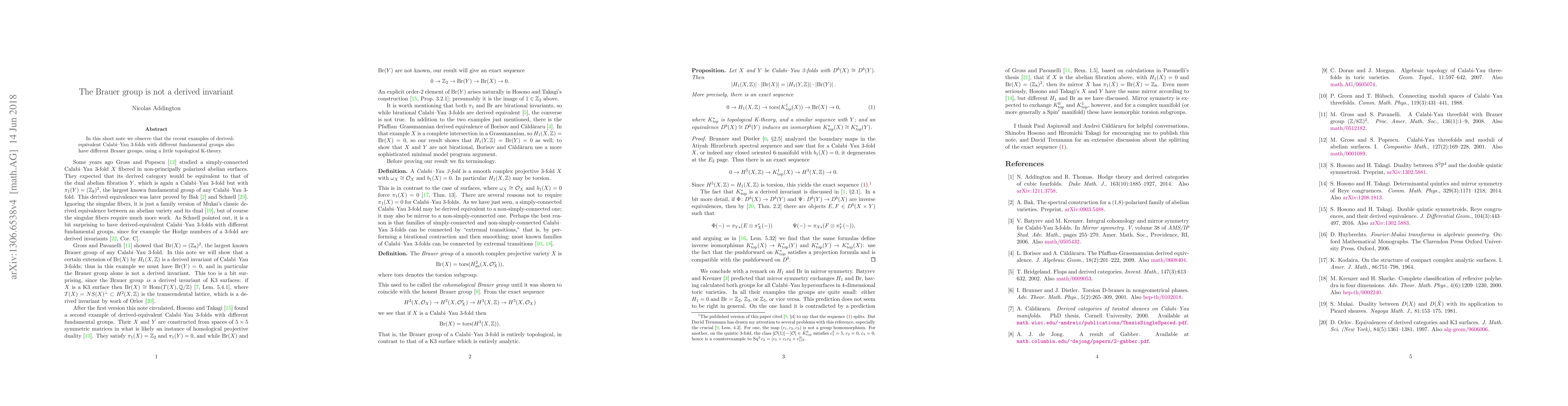 In this short note we observe that the recent examples of derived-equivalent Calabi-Yau 3-folds with different fundamental groups also have different Brauer groups, using a little topological K-theory.