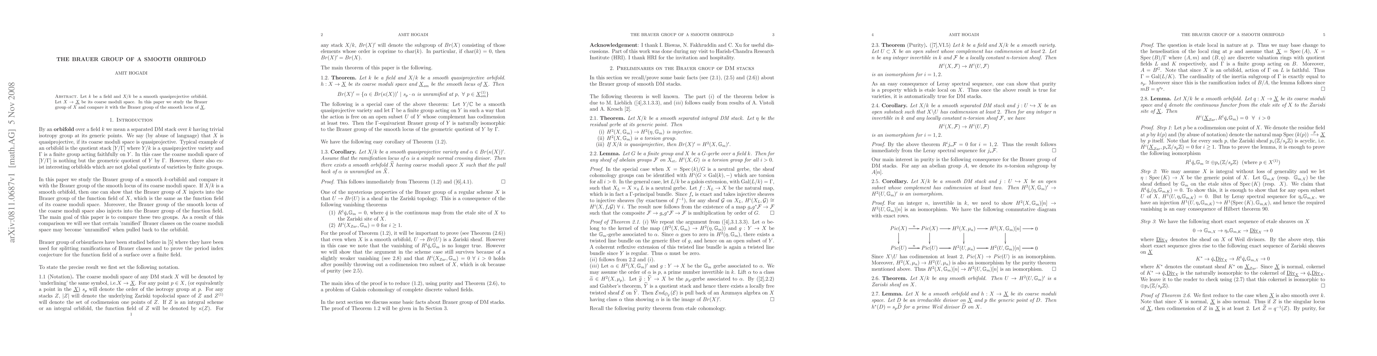This paper investigates the Brauer group of a smooth quasiprojective orbifold $X$ over a field $k$ and compares it with the Brauer group of the smooth locus of its coarse moduli space $\underline{X}$.