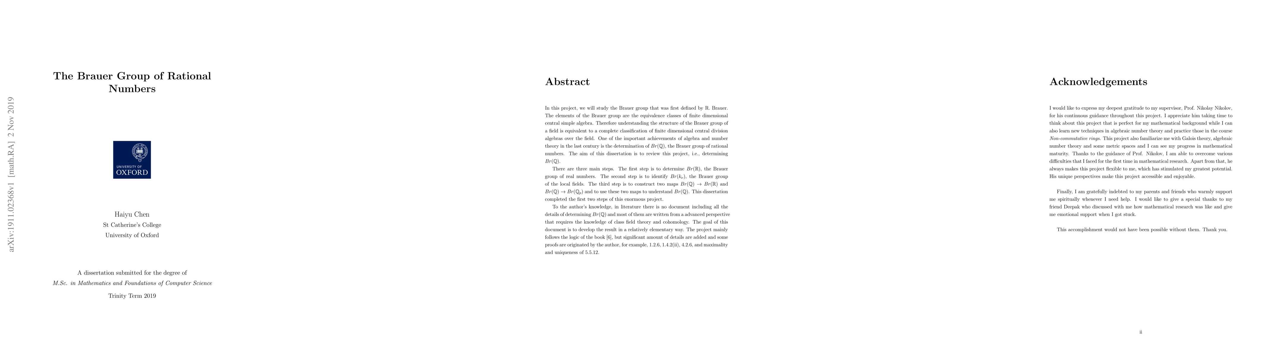 In this project, we will study the Brauer group that was first defined by R. Brauer. The elements of the Brauer group are the equivalence classes of finite dimensional central simple algebra. Therefore understanding the structure of the Brauer group of a field is equivalent to a complete classification of finite dimensional central division algebras over the field. One of the important achievements of algebra and number theory in the last century is the determination of Br(Q), the Brauer group of rational numbers. The aim of this dissertation is to review this project, i.e., determining Br(Q). There are three main steps. The first step is to determine Br(R), the Brauer group of real numbers. The second step is to identify Br(k_\nu), the Brauer group of the local fields. The third step is to construct two maps Br(Q) to Br(R) and Br(Q) to Br(Q_p) and to use these two maps to understand Br(Q). This dissertation completed the first two steps of this enormous project. To the author's knowledge, in literature there is no document including all the details of determining Br(Q) and most of them are written from a advanced perspective that requires the knowledge of class field theory and cohomology. The goal of this document is to develop the result in a relatively elementary way. The project mainly follows the logic of the book [6], but significant amount of details are added and some proofs are originated by the author, for example, 1.2.6, 1.4.2(ii), 4.2.6, and maximality and uniqueness of 5.5.12.