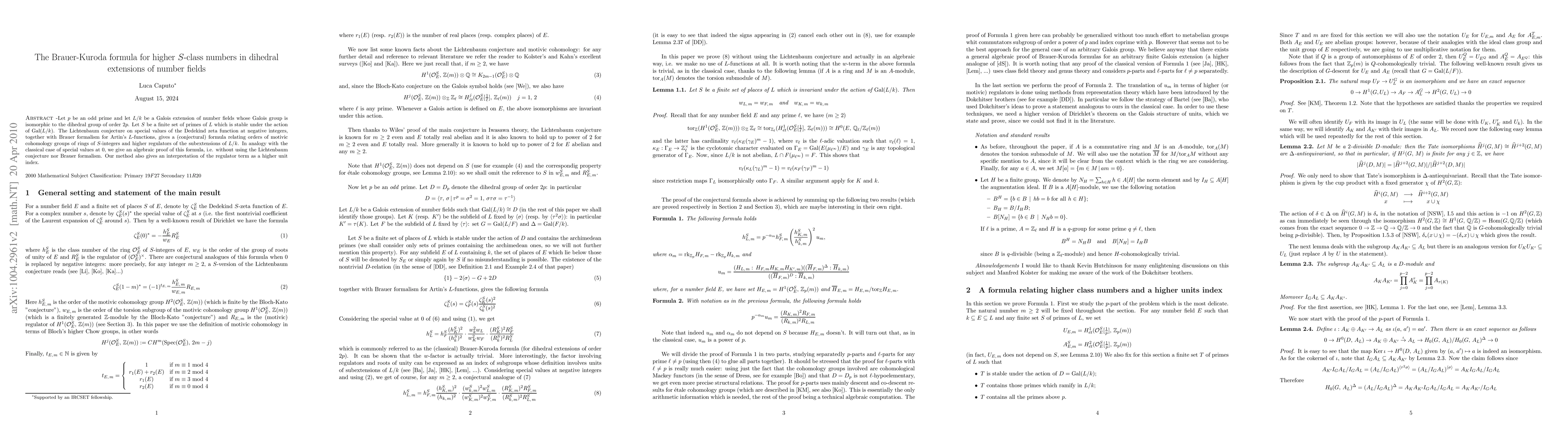 The paper proves a Brauer-Kuroda formula for higher S-class numbers in dihedral extensions of number fields using an algebraic approach, without relying on the Lichtenbaum conjecture or Brauer formalism.