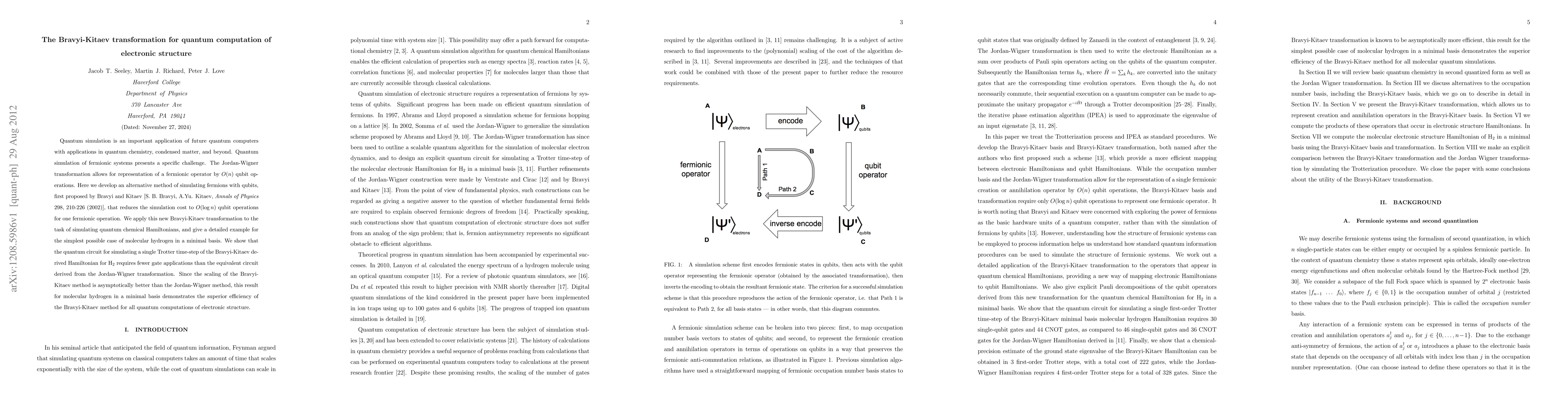 This paper introduces the Bravyi-Kitaev transformation, an alternative to the Jordan-Wigner method for simulating fermionic systems with qubits, reducing the operation cost from O(n) to O(log n). The authors demonstrate its efficiency by simulating the quantum chemical Hamiltonian of molecular hydrogen, showing fewer gate operations compared to the Jordan-Wigner method, thus proving the superior scalability of the Bravyi-Kitaev transformation for quantum computations of electronic structure.