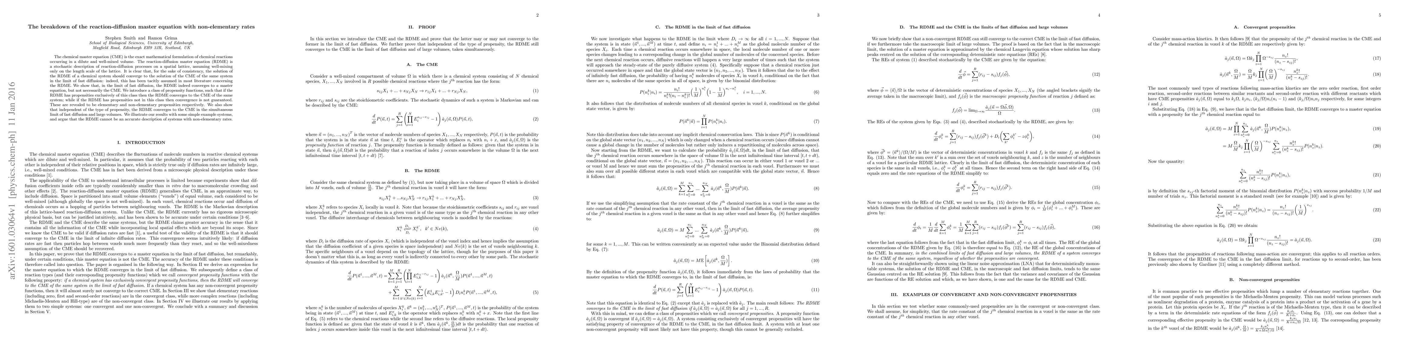This paper investigates the convergence of the reaction-diffusion master equation (RDME) to the chemical master equation (CME) under fast diffusion. It finds that RDME converges to CME only if the reaction rates are elementary, not for non-elementary rates, though it converges to CME under both fast diffusion and large volumes regardless of rate type.