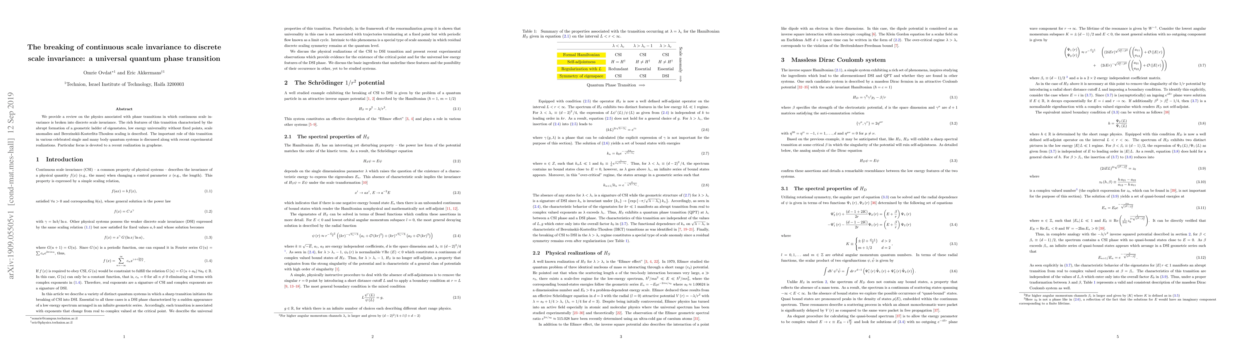 We provide a review on the physics associated with phase transitions in which continuous scale invariance is broken into discrete scale invariance. The rich features of this transition characterized by the abrupt formation of a geometric ladder of eigenstates, low energy universality without fixed points, scale anomalies and Berezinskii-Kosterlitz-Thouless scaling is described. The important role of this transition in various celebrated single and many body quantum systems is discussed along with recent experimental realizations. Particular focus is devoted to a recent realization in graphene.