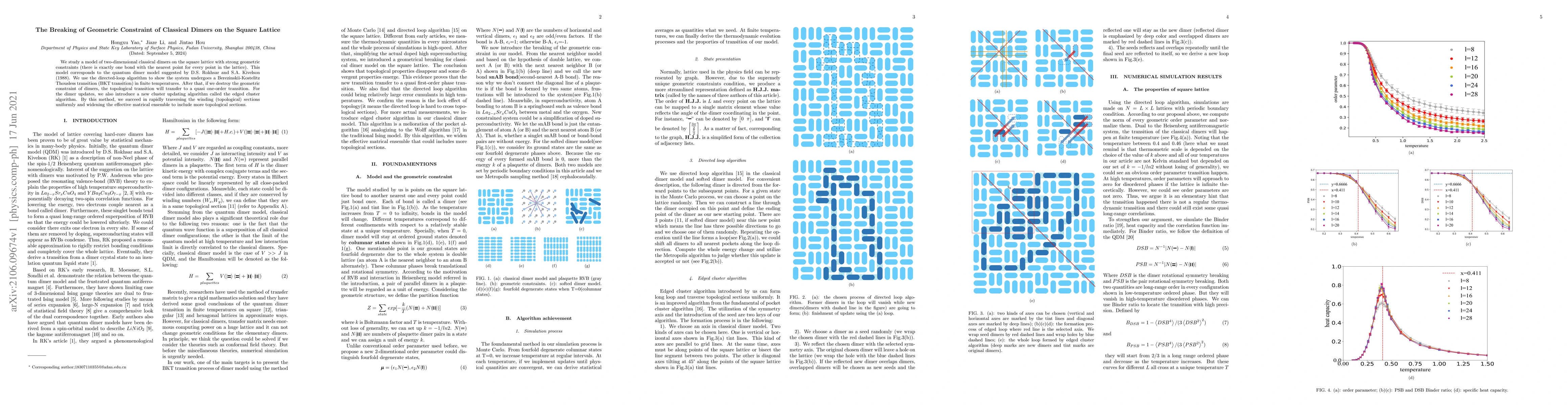This paper investigates a classical dimer model on a square lattice with strict geometric constraints, demonstrating a Berezinskii-Kostelitz-Thouless transition at finite temperatures. Upon relaxing the geometric constraints, the transition shifts to a quasi one-order transition, and a new edged cluster algorithm is introduced for efficient updates.