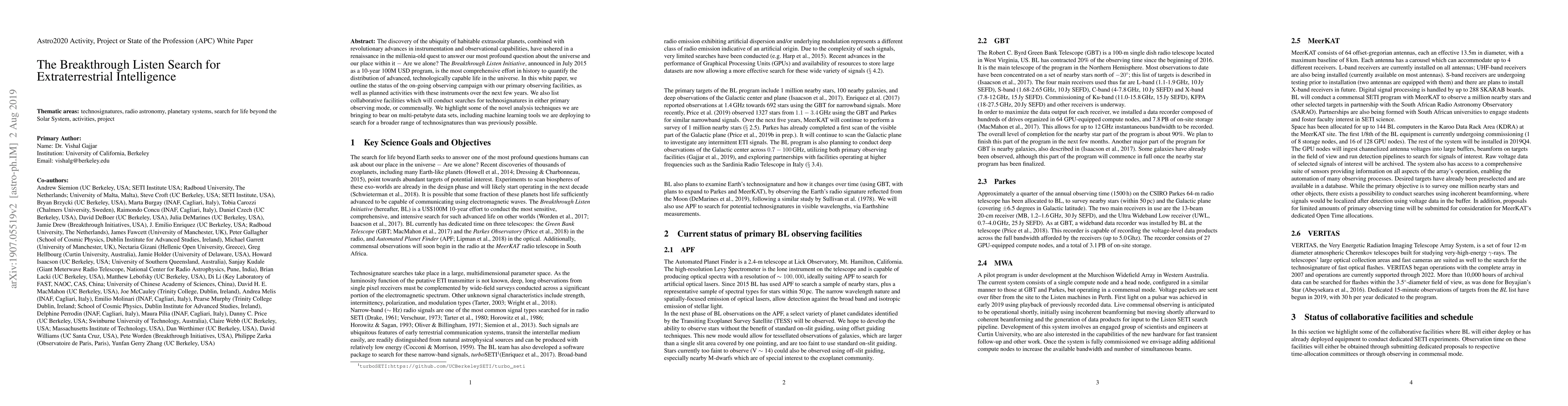 The Breakthrough Listen Initiative is a 10-year, $100M program aimed at detecting extraterrestrial intelligence through advanced instrumentation and observational techniques. The initiative employs machine learning to analyze vast data sets for technosignatures, expanding the search for technologically capable life beyond previous capabilities.