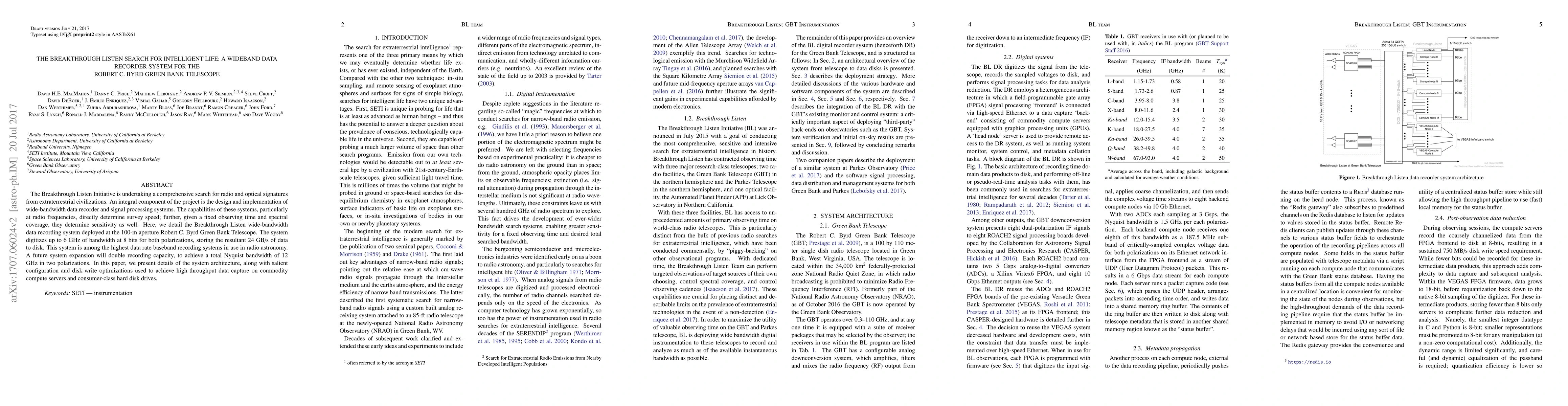 The Breakthrough Listen Initiative employs a wide-bandwidth data recorder system at the Robert C. Byrd Green Bank Telescope to capture up to 6 GHz of radio frequency data at 8 bits per sample, generating 24 GB/s of data. Future upgrades aim to double this capacity to 12 GHz.