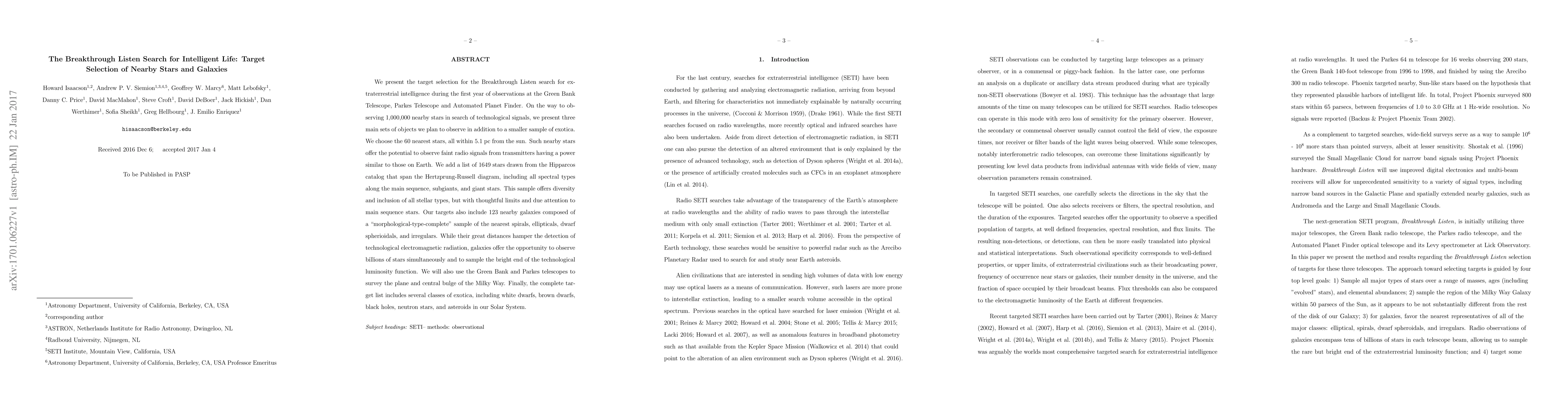The Breakthrough Listen initiative selected targets for its search for extraterrestrial intelligence, focusing on the 60 nearest stars, a diverse list of 1649 stars from the Hipparcos catalog, and 123 nearby galaxies, aiming to observe faint radio signals and sample the technological luminosity function. Additionally, it includes a survey of the Milky Way and various exotic celestial objects.