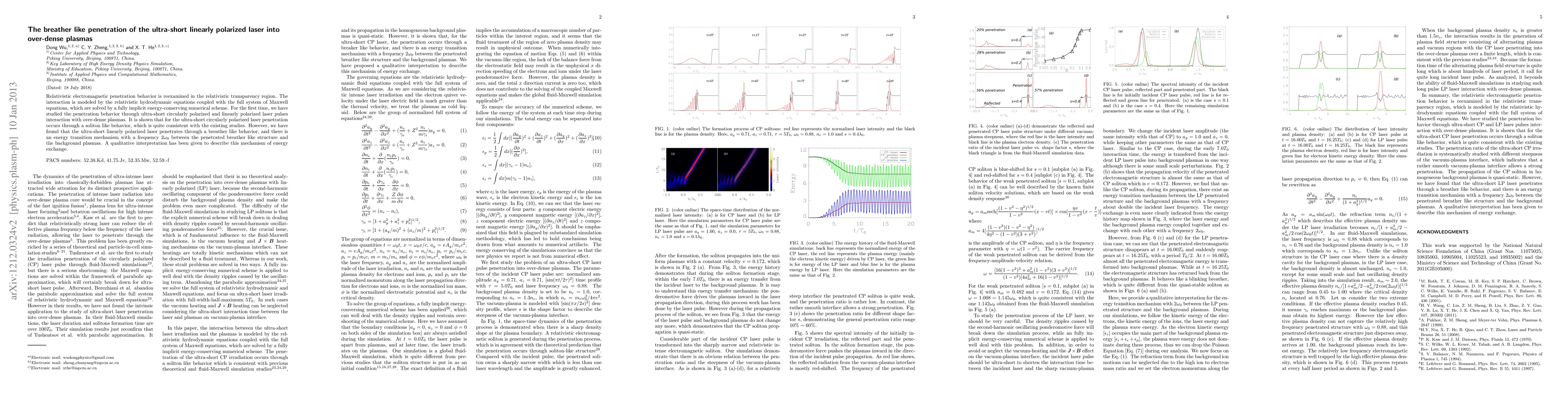 This paper investigates the penetration of ultra-short laser pulses into over-dense plasmas, revealing that while circularly polarized lasers penetrate via soliton-like behavior, linearly polarized lasers exhibit a breather-like penetration with an energy transition mechanism at frequency $2\omega_0$. The study employs relativistic hydrodynamic equations coupled with Maxwell's equations, solved numerically.