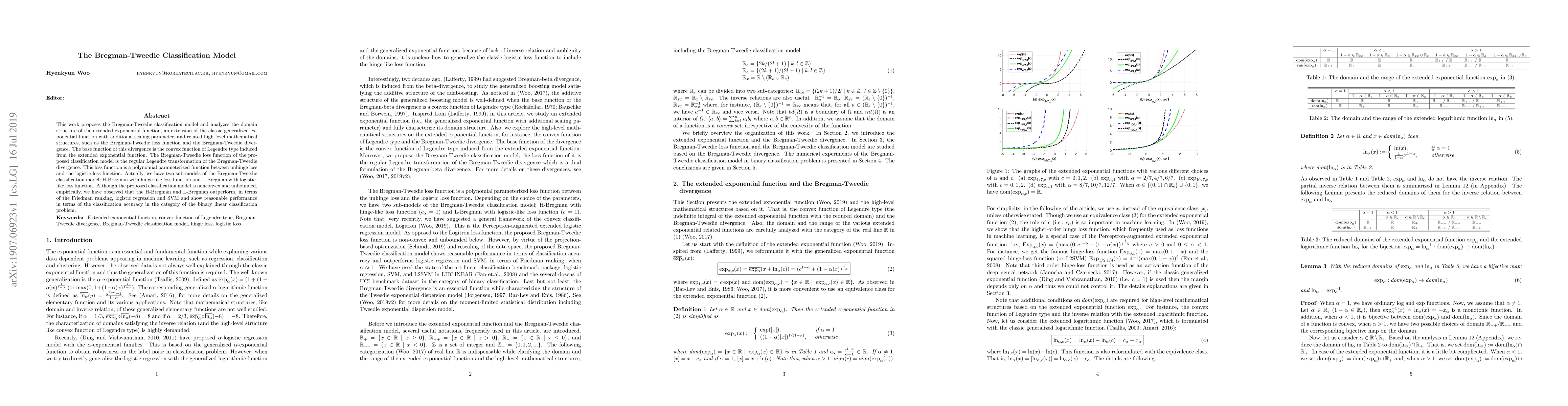 This work proposes the Bregman-Tweedie classification model and analyzes the domain structure of the extended exponential function, an extension of the classic generalized exponential function with additional scaling parameter, and related high-level mathematical structures, such as the Bregman-Tweedie loss function and the Bregman-Tweedie divergence. The base function of this divergence is the convex function of Legendre type induced from the extended exponential function. The Bregman-Tweedie loss function of the proposed classification model is the regular Legendre transformation of the Bregman-Tweedie divergence. This loss function is a polynomial parameterized function between unhinge loss and the logistic loss function. Actually, we have two sub-models of the Bregman-Tweedie classification model; H-Bregman with hinge-like loss function and L-Bregman with logistic-like loss function. Although the proposed classification model is nonconvex and unbounded, empirically, we have observed that the H-Bregman and L-Bregman outperform, in terms of the Friedman ranking, logistic regression and SVM and show reasonable performance in terms of the classification accuracy in the category of the binary linear classification problem.