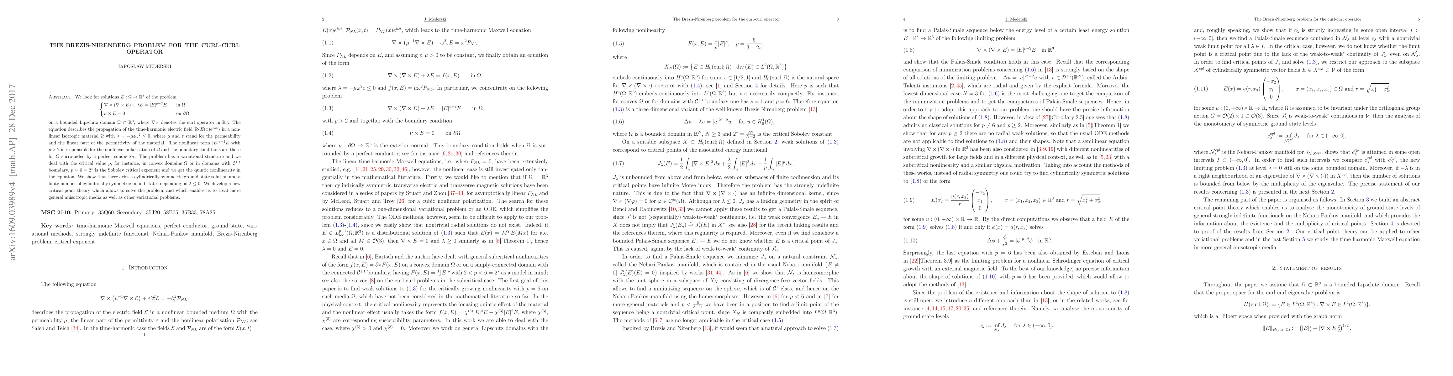 We look for solutions $E:\Omega\to\mathbb{R}^3$ of the problem $$ \left\{ \begin{aligned} &\nabla\times(\nabla\times E) +\lambda E = |E|^{p-2}E &&\quad \text{in }\Omega &\nu\times E = 0 &&\quad \text{on }\partial\Omega \end{aligned} \right. $$ on a bounded Lipschitz domain $\Omega\subset\mathbb{R}^3$, where $\nabla\times$ denotes the curl operator in $\mathbb{R}^3$. The equation describes the propagation of the time-harmonic electric field $\Re\{E(x)e^{i\omega t}\}$ in a nonlinear isotropic material $\Omega$ with $\lambda=-\mu \varepsilon \omega^2\leq 0$, where $\mu$ and $\varepsilon$ stand for the permeability and the linear part of the permittivity of the material. The nonlinear term $|E|^{p-2}E$ with $p>2$ is responsible for the nonlinear polarisation of $\Omega$ and the boundary conditions are those for $\Omega$ surrounded by a perfect conductor. The problem has a variational structure and we deal with the critical values $p$, for instance, in convex domains $\Omega$ or in domains with $\mathcal{C}^{1,1}$ boundary $p=6=2^*$ is the Sobolev critical exponent and we get the quintic nonlinearity in the equation. We show that there exist a cylindrically symmetric ground state solution and a finite number of cylindrically symmetric bound states depending on $\lambda\leq 0$. We develop a new critical point theory which allows to solve the problem, and which enables us to treat more general anisotropic media as well as other variational problems.