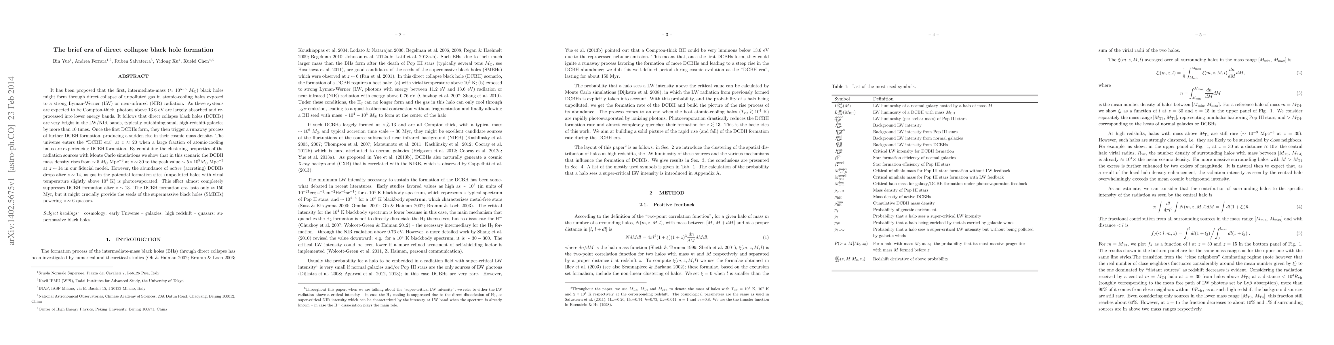 It has been proposed that the first, intermediate-mass ($\approx 10^{5-6}~M_\odot$) black holes might form through direct collapse of unpolluted gas in atomic-cooling halos exposed to a strong Lyman-Werner (LW) or near-infrared (NIR) radiation. As these systems are expected to be Compton-thick, photons above 13.6 eV are largely absorbed and re-processed into lower energy bands. It follows that direct collapse black holes (DCBHs) are very bright in the LW/NIR bands, typically outshining small high-redshift galaxies by more than 10 times. Once the first DCBHs form, they then trigger a runaway process of further DCBH formation, producing a sudden rise in their cosmic mass density. The universe enters the "DCBH era" at $z \approx 20$ when a large fraction of atomic-cooling halos are experiencing DCBH formation. By combining the clustering properties of the radiation sources with Monte Carlo simulations we show that in this scenario the DCBH mass density rises from $\sim 5$~$M_\odot$ Mpc$^{-3}$ at $z\sim 30$ to the peak value $\sim5\times10^5 M_\odot$ Mpc$^{-3}$ at $z \sim 14$ in our fiducial model. However, the abundance of \textit{active} (accreting) DCBHs drops after $z \sim 14$, as gas in the potential formation sites (unpolluted halos with virial temperature slightly above $10^4$~K) is photoevaporated. This effect almost completely suppresses DCBH formation after $z\sim 13$. The DCBH formation era lasts only $\approx 150$ Myr, but it might crucially provide the seeds of the supermassive black holes (SMBHs) powering $z\sim6$ quasars.