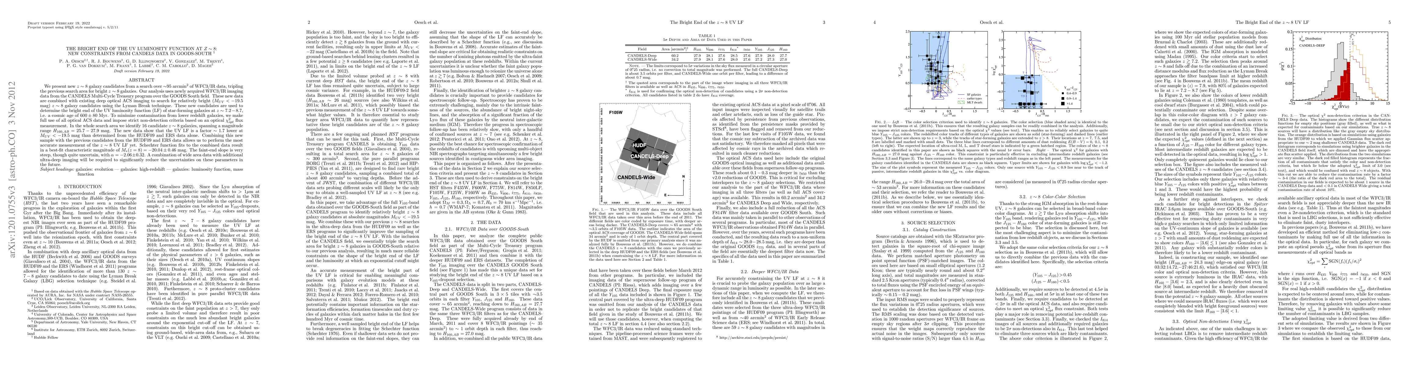 This paper presents new z~8 galaxy candidates from CANDELS data in GOODS-South, tripling the search area for bright z~8 galaxies. The analysis reveals a lower UV luminosity function at z~8 compared to previous studies, with a best-fit characteristic magnitude of M*(z=8) = -20.04±0.46 mag, indicating a steep faint-end slope.