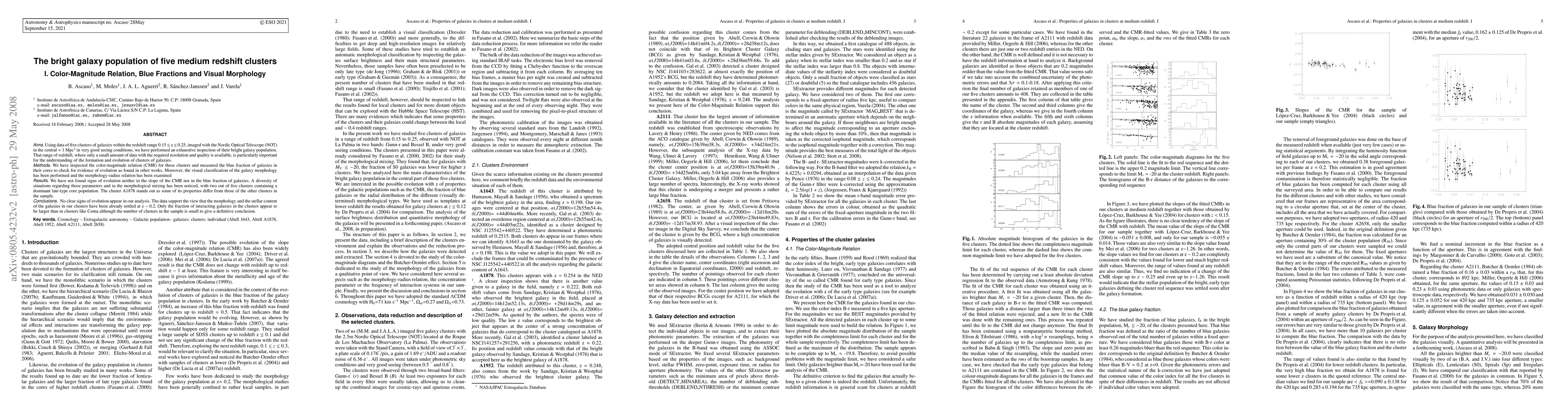 Using data of five clusters of galaxies within the redshift range 0.15 $\leq$ z $\leq$ 0.25, imaged with the Nordic Optical Telescope (NOT) in the central $\approx$ 1 Mpc$^2$ in very good seeing conditions, we have performed an exhaustive inspection of their bright galaxy population. That range of redshift, where only a small amount of data with the required resolution and quality is available, is particularly important for the understanding of the formation and evolution of clusters of galaxies. We have inspected the color-magnitude relation (CMR) for those clusters and measured the blue fraction of galaxies in their cores to check for evidence of evolution as found in other works. Moreover, the visual classification of the galaxy morphology has been performed and the morphology-radius relation has been examined We have not found signs of evolution neither in the slope of the CMR nor in the blue fraction of galaxies. A diversity of situations regarding those parameters and in the morphological mixing has been noticed, with two out of five clusters containing a dominant late-type core population. The cluster A1878 stands out as some of its properties differ from those of the other clusters in the sample. No clear signs of evolution appear in our analysis. The data support the view that the morphology and the stellar content of the galaxies in our clusters have been already settled at z $\sim$ 0.2. Only the fraction of interacting galaxies in the clusters appear to be larger than in clusters like Coma although the number of clusters in the sample is small to give a definitive conclusion.