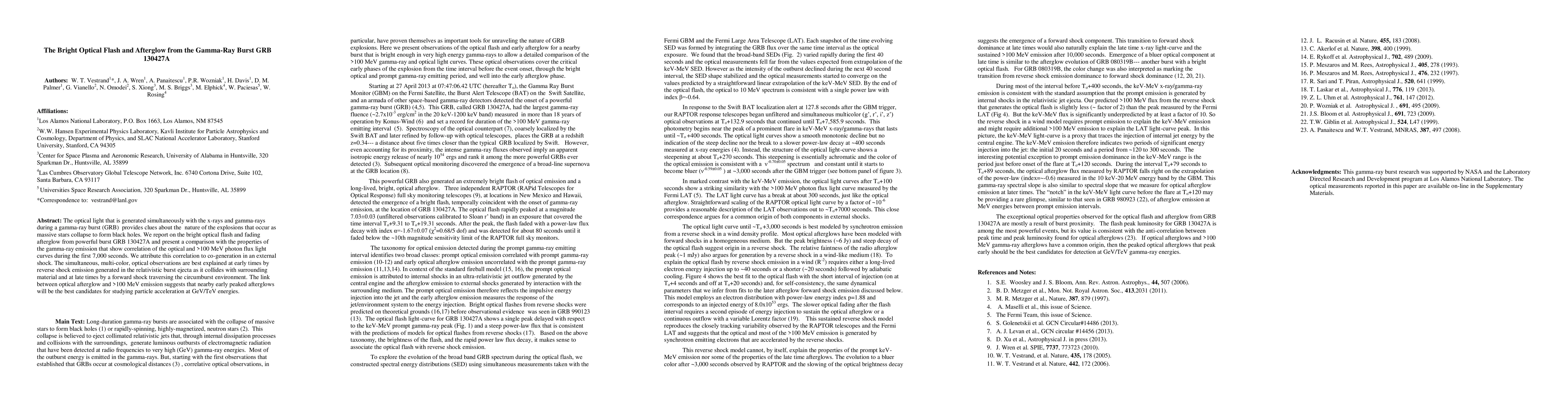 This paper investigates the bright optical flash and afterglow from GRB 130427A, revealing a correlation between optical and >100 MeV photon flux light curves, suggesting co-generation in an external shock. The findings indicate reverse shock emission at early times and forward shock at later stages, highlighting the potential for studying GRB emission at higher energies.