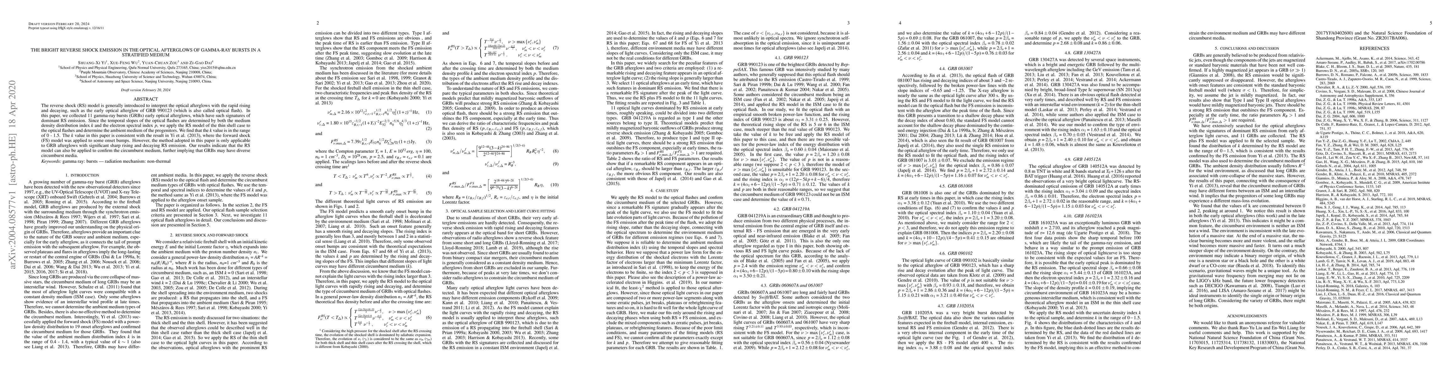 This paper investigates the reverse shock model to interpret the optical afterglows of 11 gamma-ray bursts, finding that the medium density distribution index $k$ ranges from 0 to 1.5, supporting the diversity of circumburst media around GRBs. The method is particularly effective for afterglows with significant reverse shock emission.