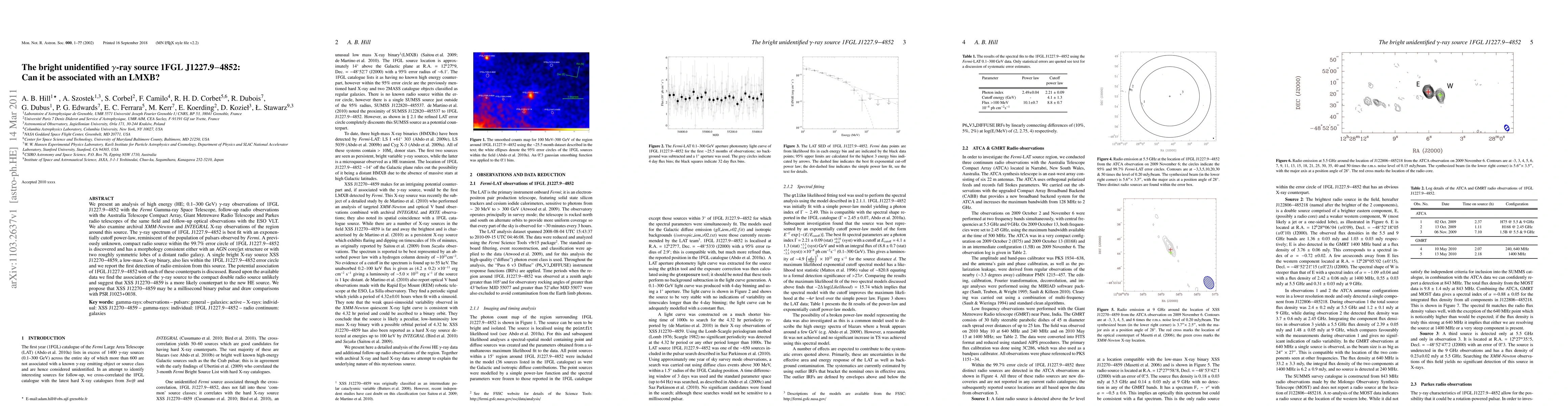 We present an analysis of high energy (HE; 0.1-300 GeV) gamma-ray observations of 1FGL J1227.9-4852 with the Fermi Gamma-ray Space Telescope, follow-up radio observations with the Australia Telescope Compact Array, Giant Metrewave Radio Telescope and Parkes radio telescopes of the same field and follow-up optical observations with the ESO VLT. We also examine archival XMM-Newton and INTEGRAL X-ray observations of the region around this source. The gamma-ray spectrum of 1FGL J1227.9-4852 is best fit with an exponentially cutoff power-law, reminiscent of the population of pulsars observed by Fermi. A previously unknown, compact radio source within the 99.7% error circle of 1FGL J1227.9-4852 is discovered and has a morphology consistent either with an AGN core/jet structure or with two roughly symmetric lobes of a distant radio galaxy. A single bright X-ray source XSS J12270-4859, a low-mass X-ray binary, also lies within the 1FGL J1227.9-4852 error circle and we report the first detection of radio emission from this source. The potential association of 1FGL J1227.9-4852 with each of these counterparts is discussed. Based upon the available data we find the association of the gamma-ray source to the compact double radio source unlikely and suggest that XSS J12270-4859 is a more likely counterpart to the new HE source. We propose that XSS J12270-4859 may be a millisecond binary pulsar and draw comparisons with PSR J1023+0038.