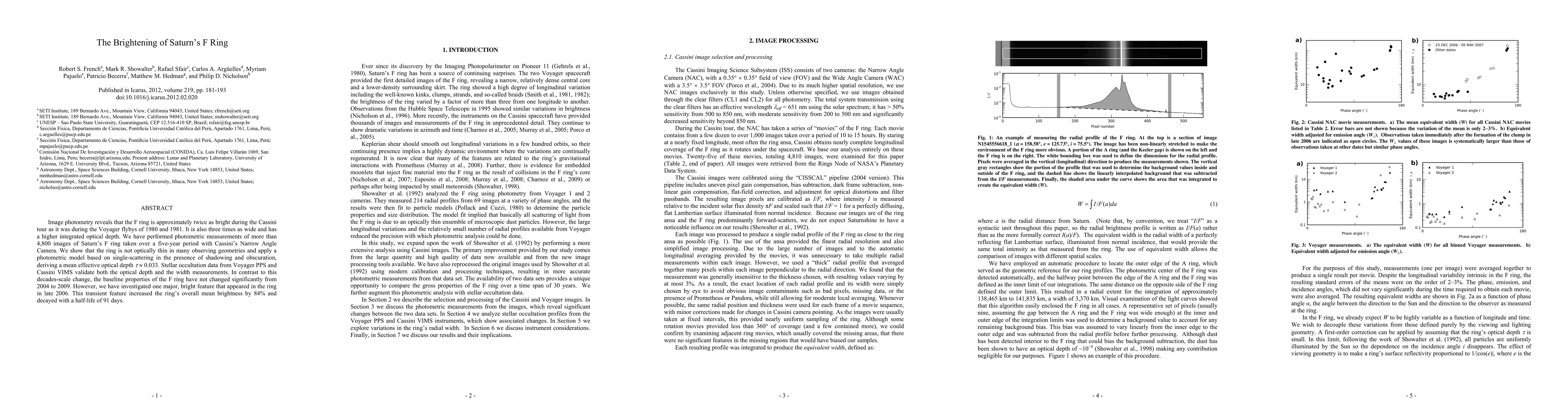 Saturn's F ring appears brighter, wider, and thicker in recent years compared to Voyager flybys, with a major transient feature contributing to its increased brightness.