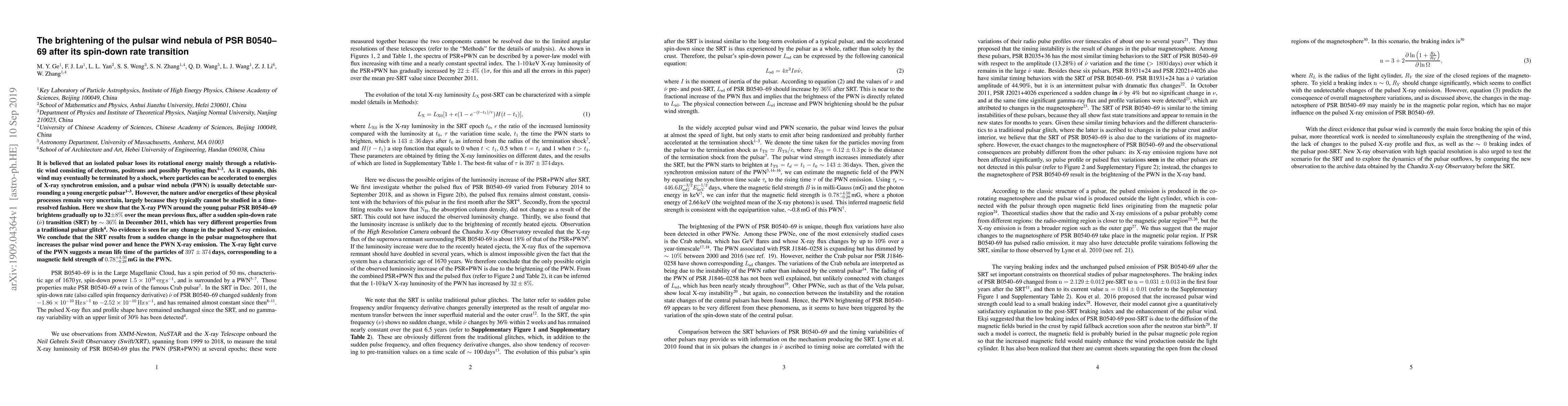 The X-ray pulsar wind nebula (PWN) around PSR B0540--69 brightened by 32$\pm8\%$ after a spin-down rate transition in December 2011, indicating a sudden increase in pulsar wind power. The PWN's mean particle lifetime and magnetic field strength were estimated to be $397\pm374$ days and $0.78_{-0.28}^{+4.50}$ mG, respectively.