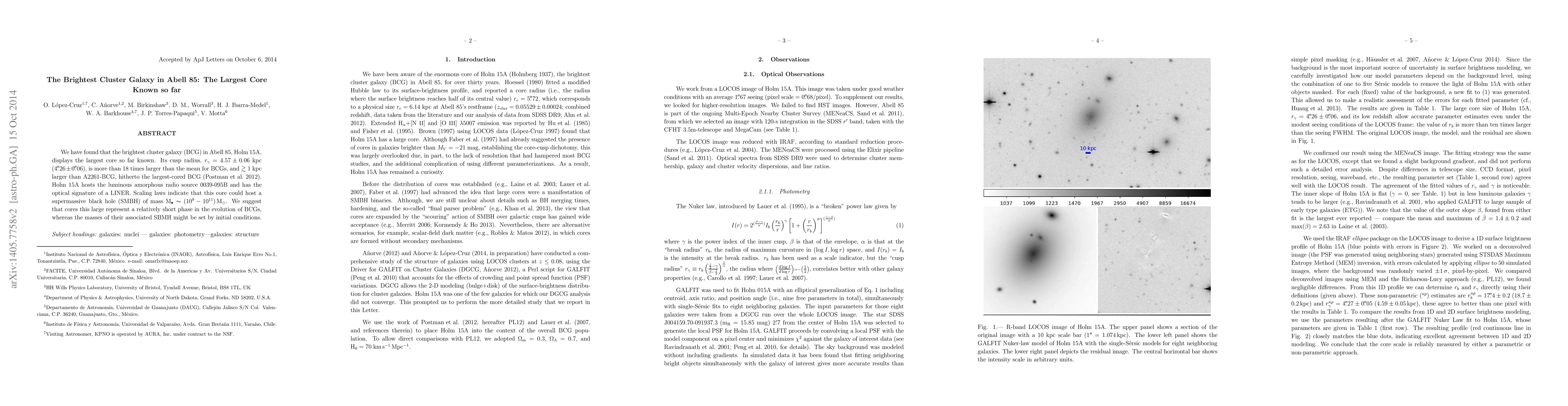 We have found that the brightest cluster galaxy (BCG) in Abell~85, Holm 15A, displays the largest core so far known. Its cusp radius, $r_{\gamma} = 4.57 \pm 0.06$ kpc ($4.26^{\prime\prime}\pm 0.06^{\prime\prime}$), is more than 18 times larger than the mean for BCGs, and $\geq1$ kpc larger than A2261-BCG, hitherto the largest-cored BCG (Postman, Lauer, Donahue, et al. 2012) Holm 15A hosts the luminous amorphous radio source 0039-095B and has the optical signature of a LINER. Scaling laws indicate that this core could host a supermassive black hole (SMBH) of mass $M_{\bullet}\thicksim (10^{9}-10^{11})\,M_{\odot}$. We suggest that cores this large represent a relatively short phase in the evolution of BCGs, whereas the masses of their associated SBMH might be set by initial conditions.