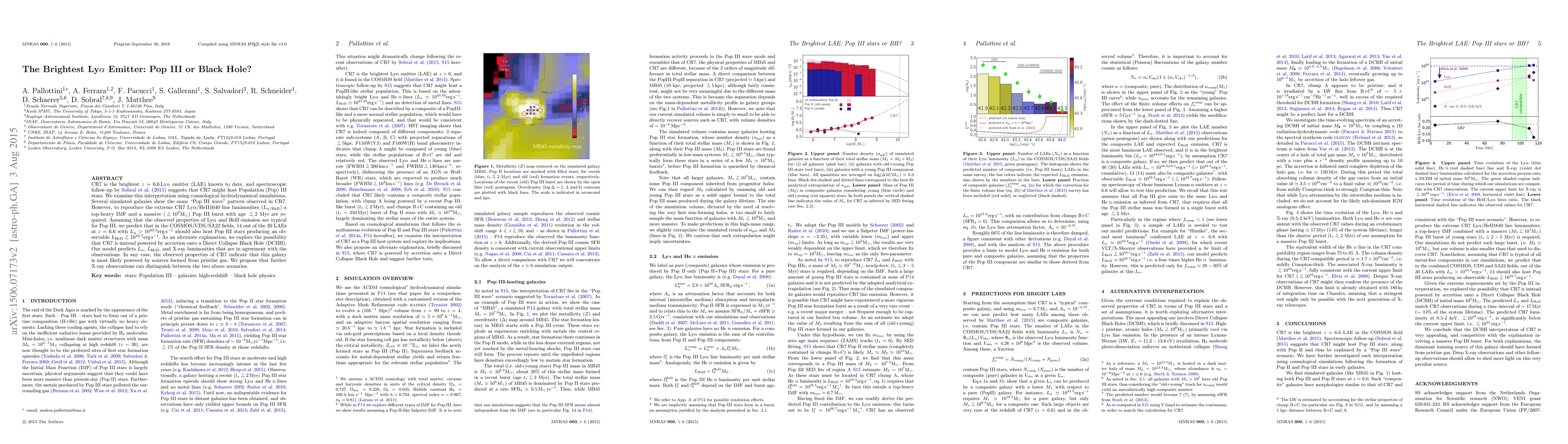 CR7 is the brightest $z=6.6 \, {\rm Ly}\alpha$ emitter (LAE) known to date, and spectroscopic follow-up by Sobral et al. (2015) suggests that CR7 might host Population (Pop) III stars. We examine this interpretation using cosmological hydrodynamical simulations. Several simulated galaxies show the same "Pop III wave" pattern observed in CR7. However, to reproduce the extreme CR7 ${\rm Ly}\alpha$/HeII1640 line luminosities ($L_{\rm \alpha/He II}$) a top-heavy IMF and a massive ($>10^{7}{\rm M}_{\odot}$) PopIII burst with age $<2$ Myr are required. Assuming that the observed properties of ${\rm Ly}\alpha$ and HeII emission are typical for Pop III, we predict that in the COSMOS/UDS/SA22 fields, 14 out of the 30 LAEs at $z=6.6$ with $L_{\alpha} >10^{43.3}{\rm erg}\,{\rm s}^{-1}$ should also host Pop III stars producing an observable $L_{\rm He II}>10^{42.7}{\rm erg}\,{\rm s}^{-1}$. As an alternate explanation, we explore the possibility that CR7 is instead powered by accretion onto a Direct Collapse Black Hole (DCBH). Our model predicts $L_{\alpha}$, $L_{\rm He II}$, and X-ray luminosities that are in agreement with the observations. In any case, the observed properties of CR7 indicate that this galaxy is most likely powered by sources formed from pristine gas. We propose that further X-ray observations can distinguish between the two above scenarios.