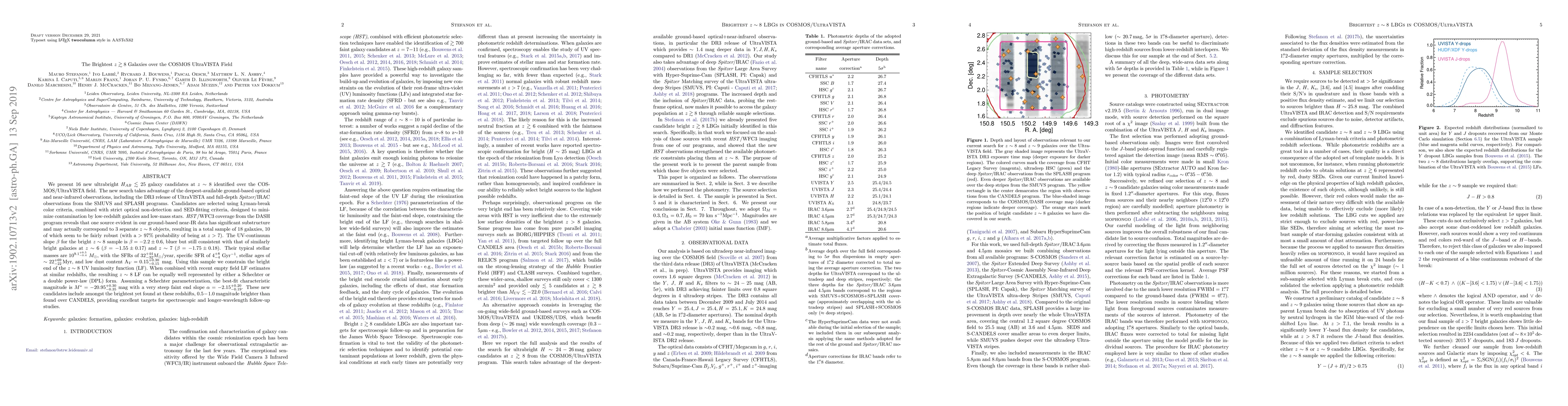 This paper identifies 16 new ultrabright galaxies at z~8 in the COSMOS/UltraVISTA field, using deep ground-based and Spitzer observations, and confirms 10 as robust z>7 candidates. These galaxies have blue UV-continuum slopes and low dust content, providing insights into the bright end of the z~8 UV luminosity function.