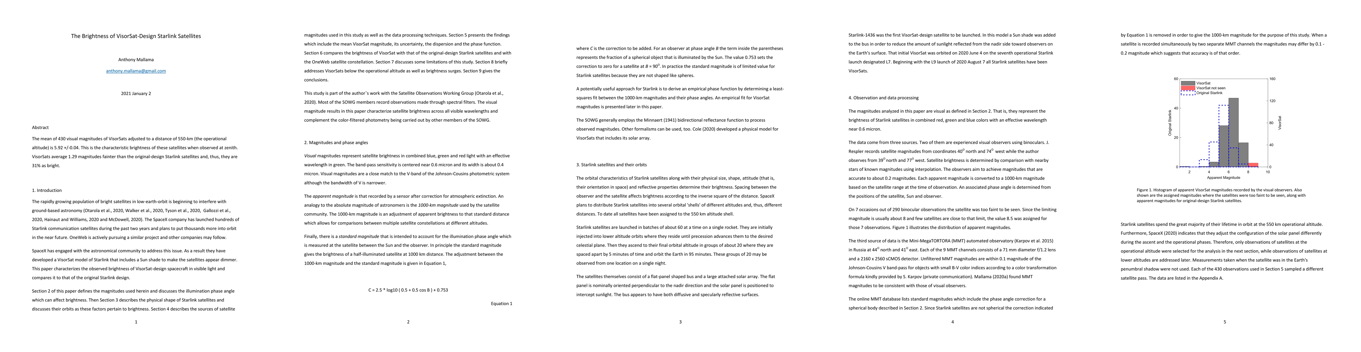 The research analyzed magnitudes of VisorSat satellites at 550 km altitude, measured by the MMT automated observatory in Russia and visual observers in the US, using MMT standard magnitudes and phase angles estimated by eye from track plots.