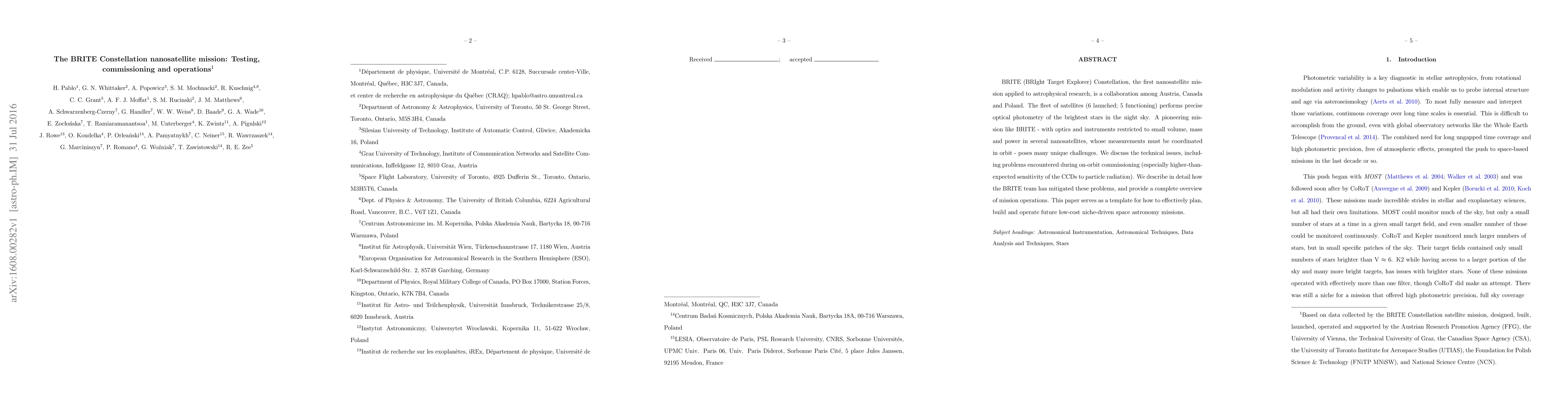 The BRITE Constellation nanosatellite mission, a pioneering collaboration among Austria, Canada, and Poland, launched six satellites to perform precise optical photometry of the brightest stars. The paper details the technical challenges faced during commissioning, especially unexpected CCD sensitivity to particle radiation, and outlines the strategies used to mitigate these issues, providing a comprehensive overview of mission operations.