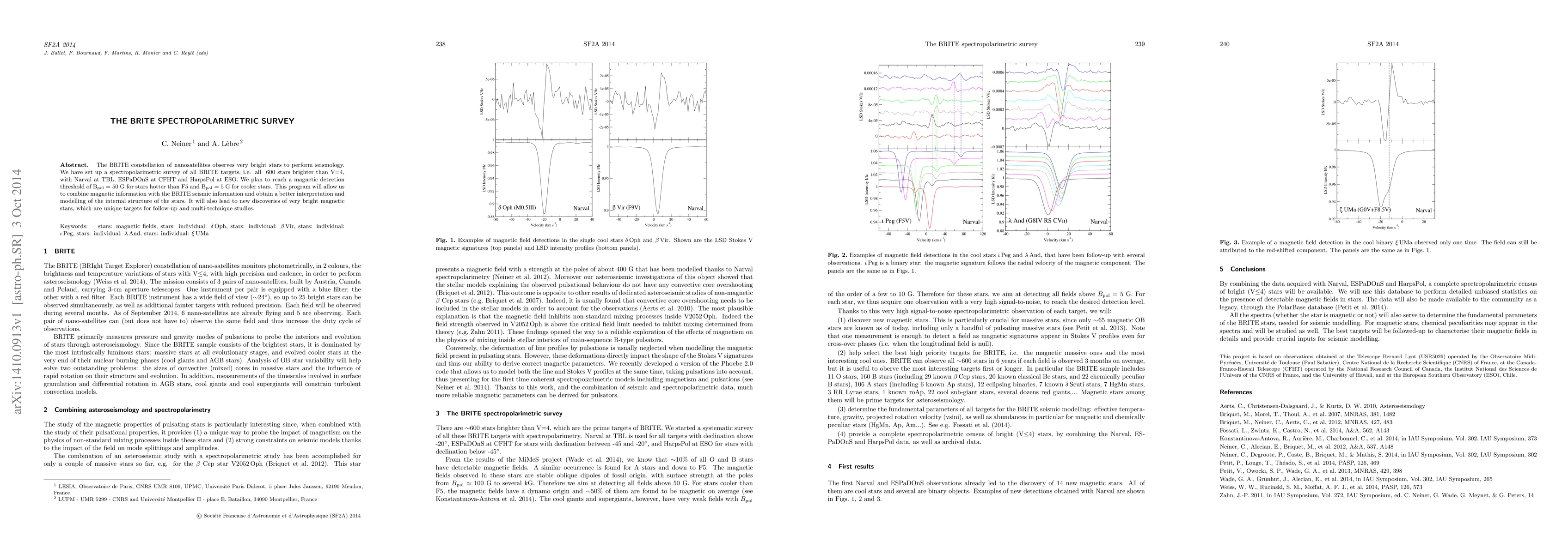 The BRITE spectropolarimetric survey uses nanosatellites to measure magnetic fields in bright stars, combining this with seismic data to study internal structures and discover new magnetic star targets.
