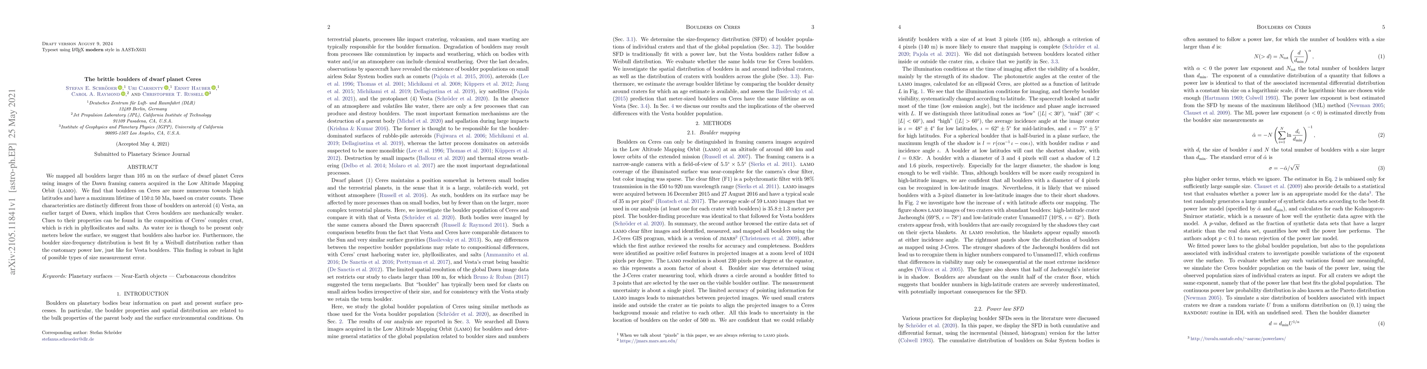 This study maps large boulders on Ceres, revealing they are more abundant at high latitudes and have a short maximum lifetime of 150±50 Ma, indicating mechanical weakness compared to Vesta. The unique composition of Ceres' crust suggests that these boulders may contain water ice.