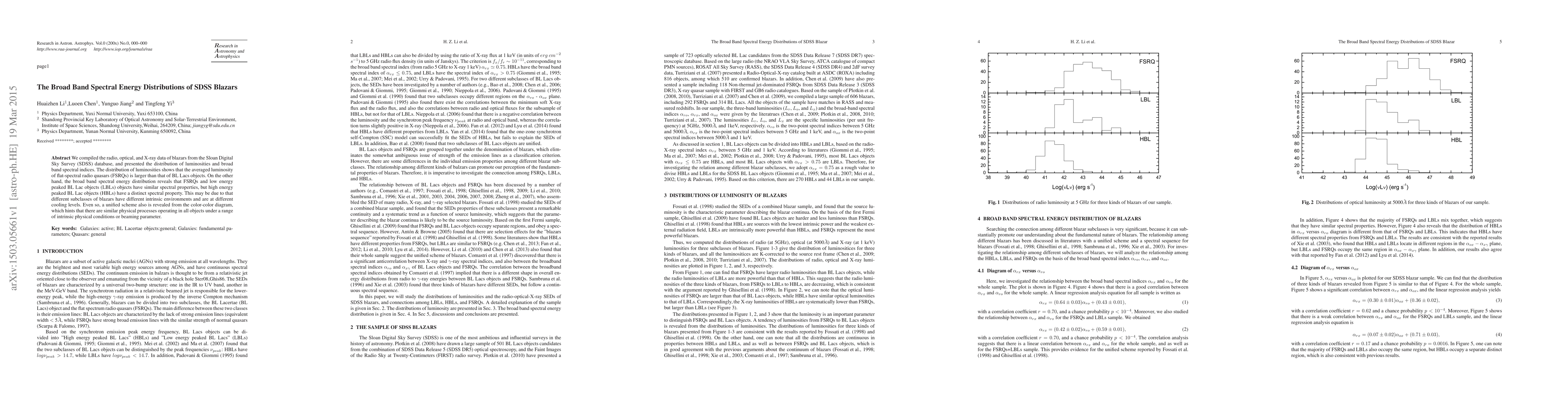 We compiled the radio, optical, and X-ray data of blazars from the Sloan Digital Sky Survey (SDSS) database, and presented the distribution of luminosities and broad band spectral indices. The distribution of luminosities shows that the averaged luminosity of flat-spectral radio quasars (FSRQs) is larger than that of BL Lacs objects. On the other hand, the broad band spectral energy distribution reveals that FSRQs and low energy peaked BL Lac objects (LBLs) objects have similar spectral properties, but high energy peaked BL Lac objects (HBLs) have a distinct spectral property. This may be due to that different subclasses of blazars have different intrinsic environments and are at different cooling levels. Even so, a unified scheme also is revealed from the color-color diagram, which hints that there are similar physical processes operating in all objects under a range of intrinsic physical conditions or beaming parameter.