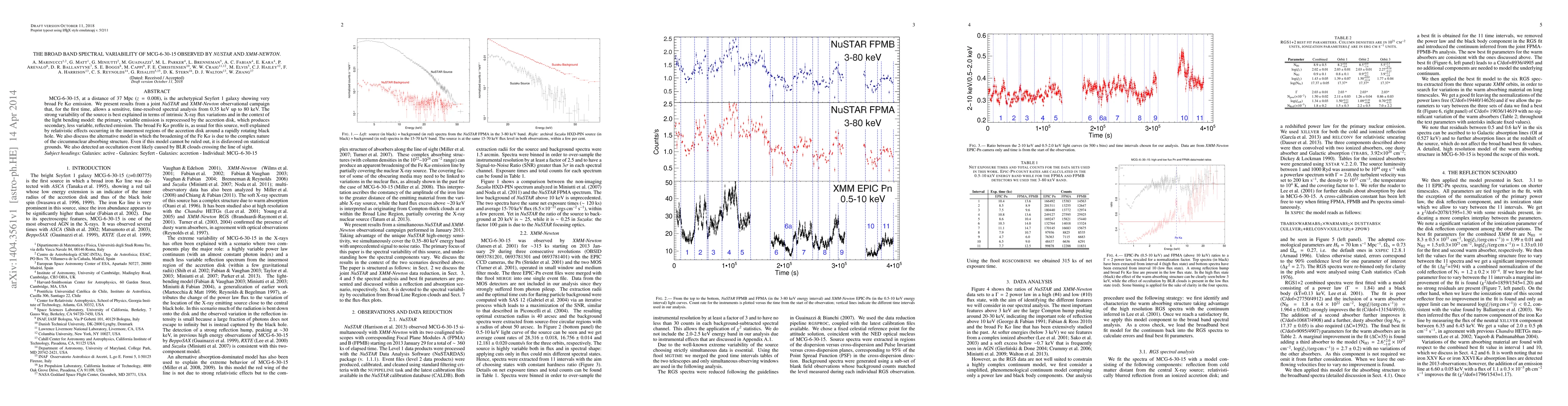 MCG-6-30-15, at a distance of 37 Mpc (z=0.008), is the archetypical Seyfert 1 galaxy showing very broad Fe K$\alpha$ emission. We present results from a joint NuSTAR and XMM-Newton observational campaign that, for the first time, allows a sensitive, time-resolved spectral analysis from 0.35 keV up to 80 keV. The strong variability of the source is best explained in terms of intrinsic X-ray flux variations and in the context of the light bending model: the primary, variable emission is reprocessed by the accretion disk, which produces secondary, less variable, reflected emission. The broad Fe K$\alpha$ profile is, as usual for this source, well explained by relativistic effects occurring in the innermost regions of the accretion disk around a rapidly rotating black hole. We also discuss the alternative model in which the broadening of the Fe K$\alpha$ is due to the complex nature of the circumnuclear absorbing structure. Even if this model cannot be ruled out, it is disfavored on statistical grounds. We also detected an occultation event likely caused by BLR clouds crossing the line of sight.