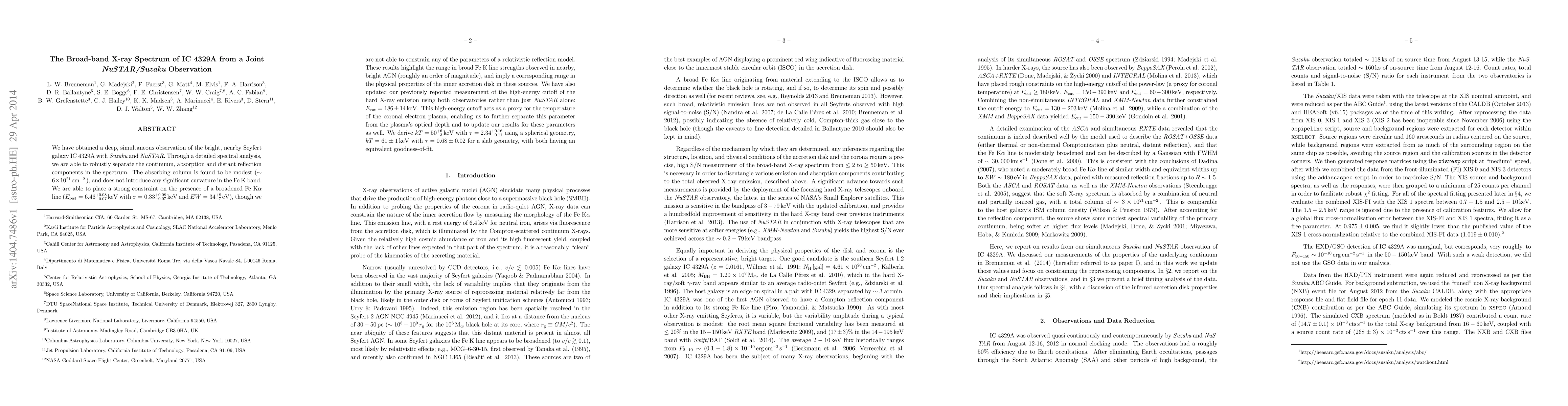We have obtained a deep, simultaneous observation of the bright, nearby Seyfert galaxy IC 4329A with Suzaku and NuSTAR. Through a detailed spectral analysis, we are able to robustly separate the continuum, absorption and distant reflection components in the spectrum. The absorbing column is found to be modest at $N_H = 6 \times 10^{21}$ cm$^2$, and does not introduce any significant curvature in the Fe K band. We are able to place a strong constraint on the presence of a broadened Fe K{\alpha} line: $E = 6.46^{+0.08}_{-0.07}$ keV rest frame with ${\sigma} = 0.33^{+0.08}_{-0.07}$ keV and $EW = 34^{+8}_{-7}$ eV, though we are not able to constrain any of the parameters of a relativistic reflection model. These results highlight the range in broad Fe K{\alpha} line strengths observed in nearby, bright AGN (roughly an order of magnitude), and imply a corresponding range in the physical properties of the inner accretion disk in these sources. We have also updated our previously reported measurement of the high-energy cutoff of the hard X-ray emission using both observatories rather than just NuSTAR alone: $E_{cut} = 186 \pm 14$ keV. This high-energy cutoff acts as a proxy for the temperature of the coronal electron plasma, enabling us to further separate this parameter from the optical depth of the plasma and to update our results for these parameters as well. We derive $kT = 50^{+6}_{-3}$ keV with ${\tau} = 2.34^{+0.16}_{-0.11}$ using a spherical geometry, $kT = 61 \pm 1$ keV with ${\tau} = 0.68 \pm 0.02$ for a slab geometry, with both having an equivalent goodness-of-fit.