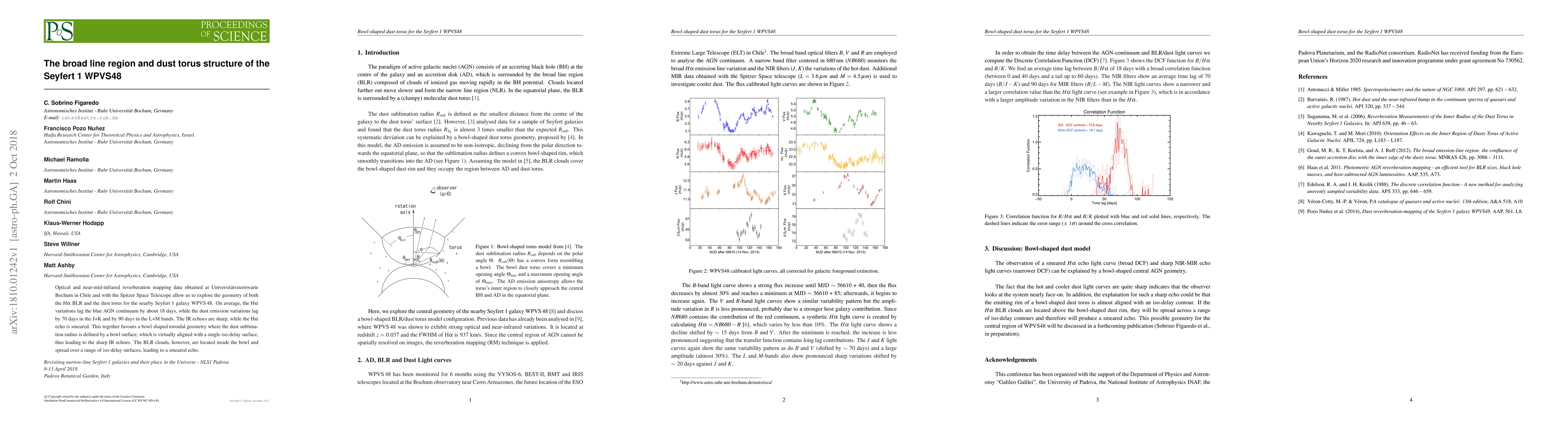 Optical and near-mid-infrared reverberation mapping data obtained at Universit\"{a}tssternwarte Bochum in Chile and with the Spitzer Space Telescope allow us to explore the geometry of both the H$\alpha$ BLR and the dust torus for the nearby Seyfert 1 galaxy WPVS\,48. On average, the H$\alpha$ variations lag the blue AGN continuum by about 18 days, while the dust emission variations lag by 70 days in the J+K and by 90 days in the L+M bands. The IR echoes are sharp, while the H$\alpha$ echo is smeared. This together favours a bowl-shaped toroidal geometry where the dust sublimation radius is defined by a bowl surface, which is virtually aligned with a single iso-delay surface, thus leading to the sharp IR echoes. The BLR clouds, however, are located inside the bowl and spread over a range of iso-delay surfaces, leading to a smeared echo.