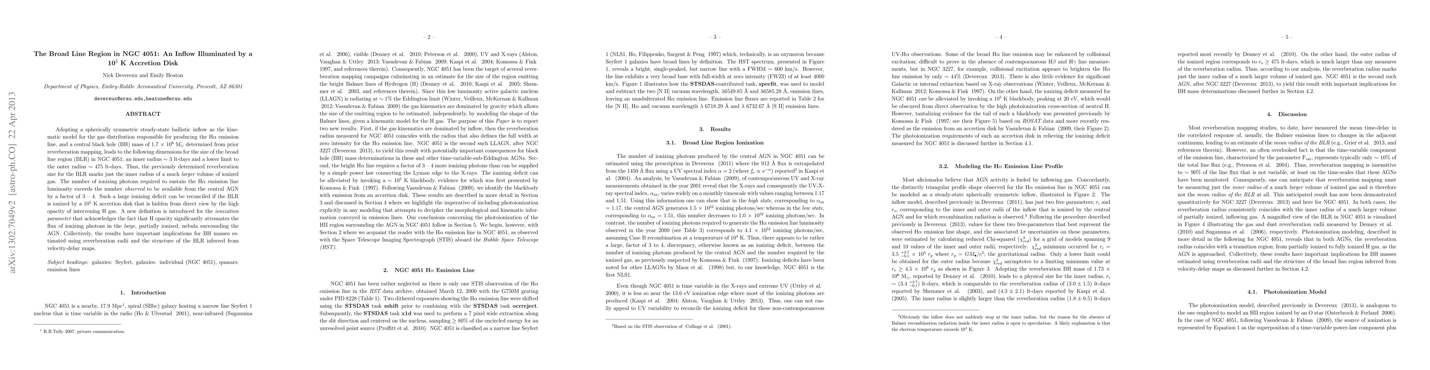Adopting a spherically symmetric steady-state ballistic inflow as the kinematic model for the gas distribution responsible for producing the H{\alpha} emission line and a central black hole (BH) mass of 1.7 x10^6 M_sun, determined from prior reverberation mapping, leads to the following dimensions for the size of the broad line region (BLR) in NGC 4051; an inner radius ~3 lt-days and a lower limit to the outer radius ~ 475 lt-days. Thus, the previously determined reverberation size for the BLR marks just the inner radius of a much larger volume of ionized gas. The number of ionizing photons required to sustain the H{\alpha} emission line luminosity exceeds the number observed to be available from the central AGN by a factor of 3 - 4. Such a large ionizing deficit can be reconciled if the BLR is ionized by a 10^5 K accretion disk that is hidden from direct view by the high opacity of intervening H gas. A new definition is introduced for the ionization parameter that acknowledges the fact that H opacity significantly attenuates the flux of ionizing photons in the large, partially ionized, nebula surrounding the AGN. Collectively, these results have important implications for BH masses estimated using reverberation radii and the structure of the BLR inferred from velocity-delay maps.