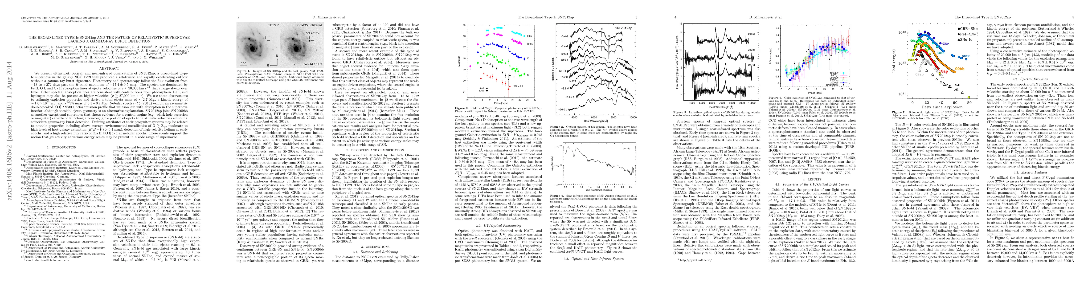 We present ultraviolet, optical, and near-infrared observations of SN 2012ap, a broad-lined Type Ic supernova in the galaxy NGC 1729 that produced a relativistic and rapidly decelerating outflow without a gamma-ray burst signature. Photometry and spectroscopy follow the flux evolution from -13 to +272 days past the B-band maximum of -17.4 +/- 0.5 mag. The spectra are dominated by Fe II, O I, and Ca II absorption lines at ejecta velocities of 20,000 km/s that change slowly over time. Other spectral absorption lines are consistent with contributions from photospheric He I, and hydrogen may also be present at higher velocities (> 27,000 km/s). We use these observations to estimate explosion properties and derive a total ejecta mass of 2.7 Msolar, a kinetic energy of 1.0x10^{52} erg, and a 56Ni mass of 0.1-0.2 Msolar. Nebular spectra (t > 200d) exhibit an asymmetric double-peaked [OI] 6300,6364 emission profile that we associate with absorption in the supernova interior, although toroidal ejecta geometry is an alternative explanation. SN 2012ap joins SN 2009bb as another exceptional supernova that shows evidence for a central engine (e.g., black-hole accretion or magnetar) capable of launching a non-negligible portion of ejecta to relativistic velocities without a coincident gamma-ray burst detection. Defining attributes of their progenitor systems may be related to notable properties including above-average environmental metallicities of Z > Zsolar, moderate to high levels of host-galaxy extinction (E(B-V) > 0.4 mag), detection of high-velocity helium at early epochs, and a high relative flux ratio of [Ca II]/[O I] > 1 at nebular epochs. These events support the notion that jet activity at various energy scales may be present in a wide range of supernovae.