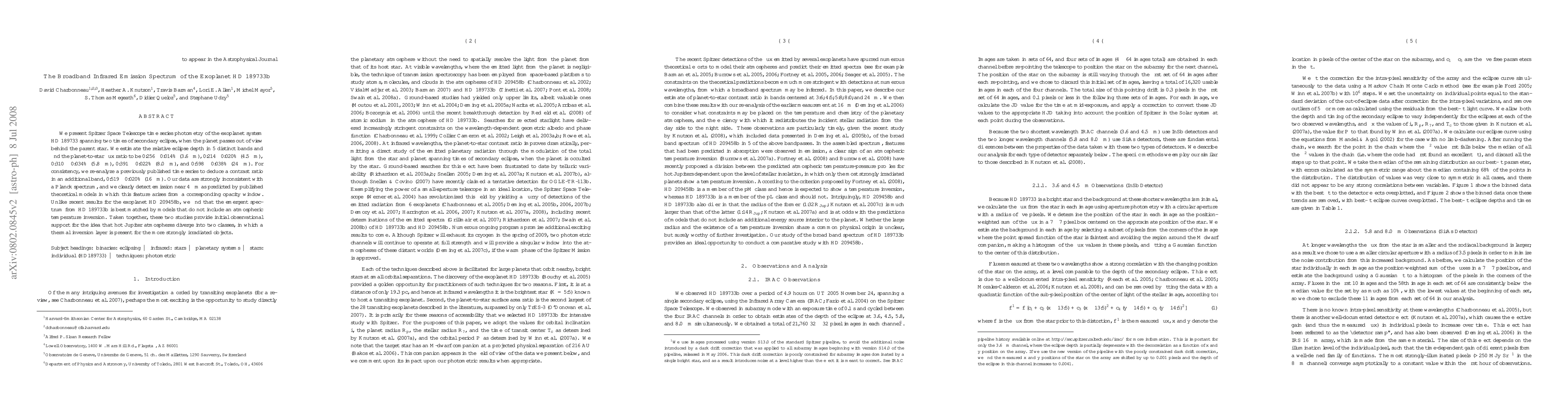 This study uses Spitzer Space Telescope data to analyze the infrared emission spectrum of the exoplanet HD 189733b during secondary eclipses, finding distinct flux ratios across multiple bands. Unlike HD 209458b, HD 189733b's spectrum does not support atmospheric temperature inversions, suggesting hot Jupiter atmospheres may fall into two distinct classes.
