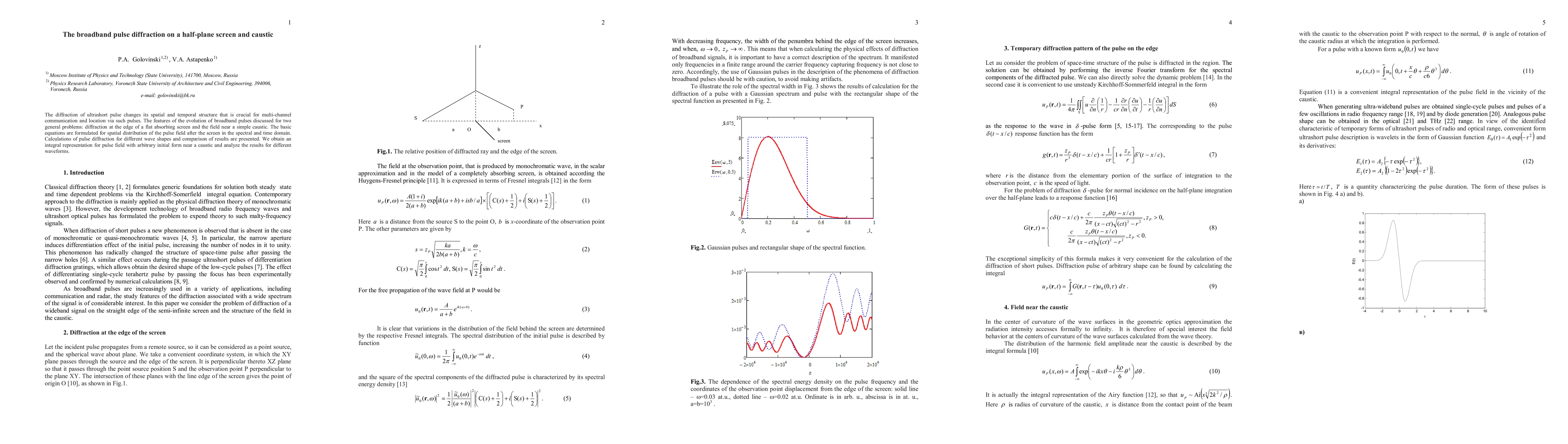 This paper explores the diffraction of ultrashort pulses over half-plane screens and near simple caustics, revealing how their spatial and temporal structures change. It presents integral representations for pulse fields with various initial forms near caustics, comparing results for different waveforms, crucial for multi-channel communication and location applications.