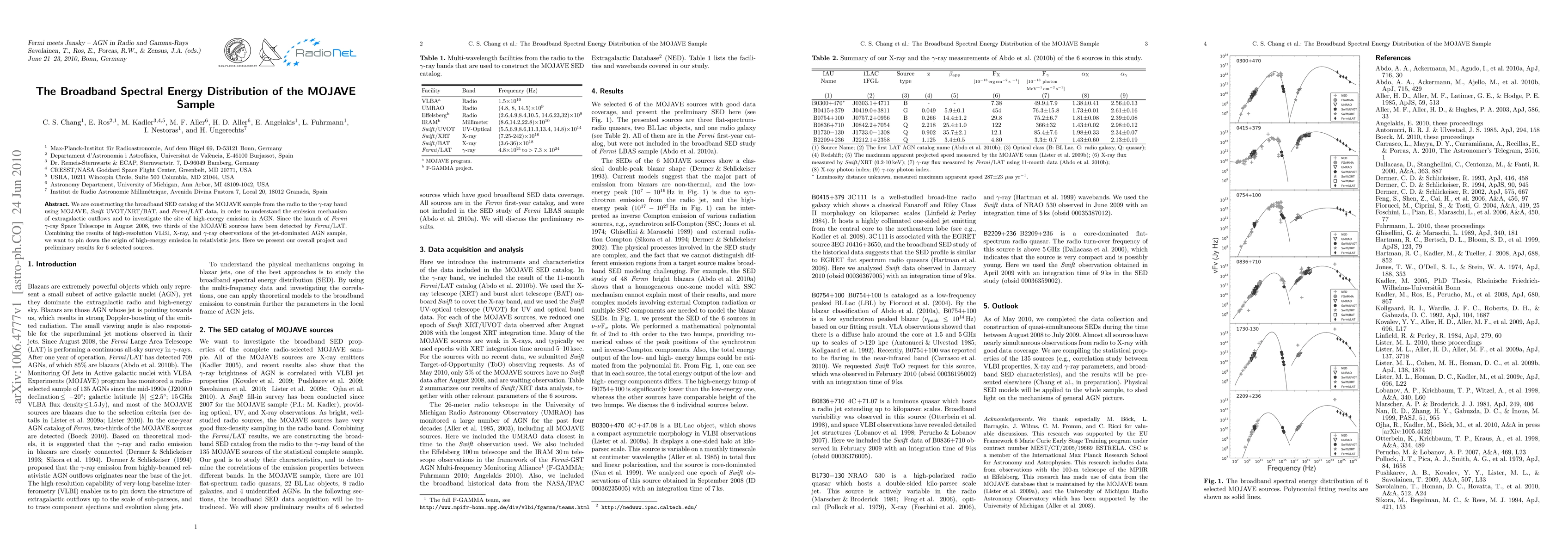 The research constructs a broadband SED catalog for the MOJAVE sample, utilizing data from MOJAVE, Swift UVOT/XRT/BAT, and Fermi/LAT, to understand emission mechanisms in extragalactic outflows and pinpoint the site of high-energy emission in AGN.