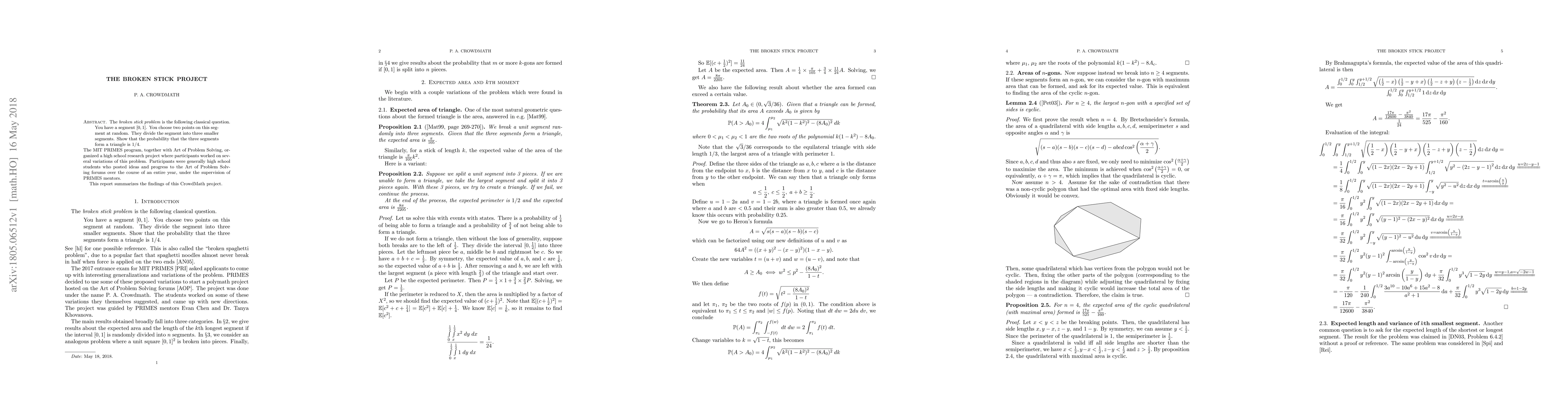 The broken stick problem is the following classical question. You have a segment $[0,1]$. You choose two points on this segment at random. They divide the segment into three smaller segments. Show that the probability that the three segments form a triangle is $1/4$. The MIT PRIMES program, together with Art of Problem Solving, organized a high school research project where participants worked on several variations of this problem. Participants were generally high school students who posted ideas and progress to the Art of Problem Solving forums over the course of an entire year, under the supervision of PRIMES mentors. This report summarizes the findings of this CrowdMath project.