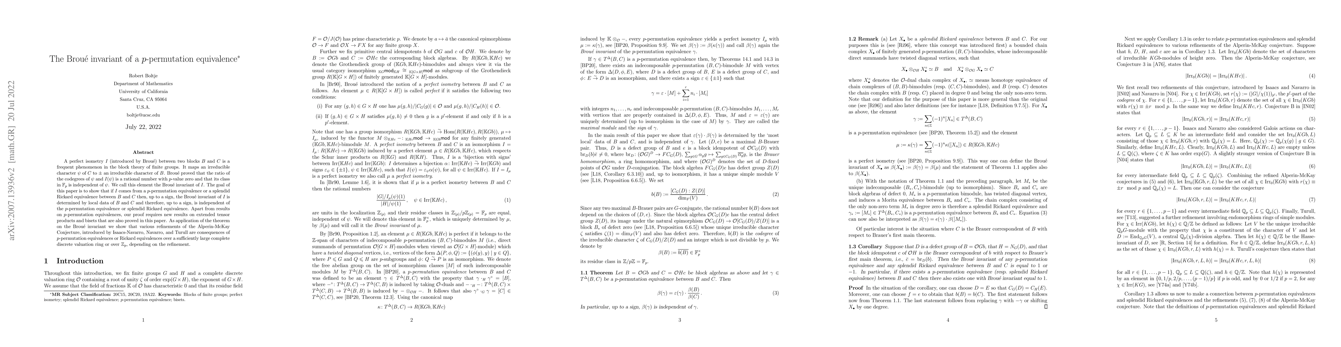A perfect isometry $I$ (introduced by Brou\'e) between two blocks $B$ and $C$ is a frequent phenomenon in the block theory of finite groups. It maps an irreducible character $\psi$ of $C$ to $\pm$ an irreducible character of $B$. Brou\'e proved that the ratio of the codegrees of $\psi$ and $I(\psi)$ is a rational number with $p$-value zero and that its class in $\mathbb{F}_p$ is independent of $\psi$. We call this element the Brou\'e invariant of $I$. The goal of this paper is to show that if $I$ comes from a $p$-permutation equivalence or a splendid Rickard equivalence between $B$ and $C$ then, up to a sign, the Brou\'e invariant of $I$ is determined by local data of $B$ and $C$ and therefore, up to a sign, is independent of the $p$-permutation equivalence or splendid Rickard equivalence. Apart from results on $p$-permutation equivalences, our proof requires new results on extended tensor products and bisets that are also proved in this paper. As application of the theorem on the Brou\'e invariant we show that various refinements of the Alperin-McKay Conjecture, introduced by Isaacs-Navarro, Navarro, and Turull are consequences of $p$-permutation equivalences or Rickard equivalences over a sufficiently large complete discrete valuation ring or over $\mathbb{Z}_p$, depending on the refinement.