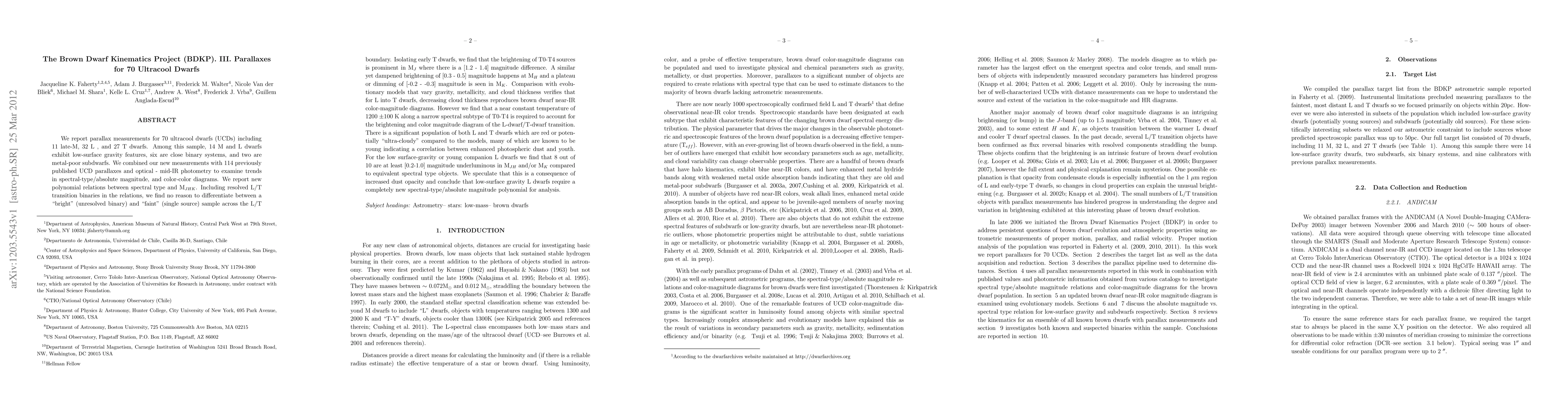 This study reports parallax measurements for 70 ultracool dwarfs, finding no difference in brightness between single-source and binary samples across the L/T boundary. The data suggests a constant temperature of 1200 K is required to explain the brightening and color of these objects.