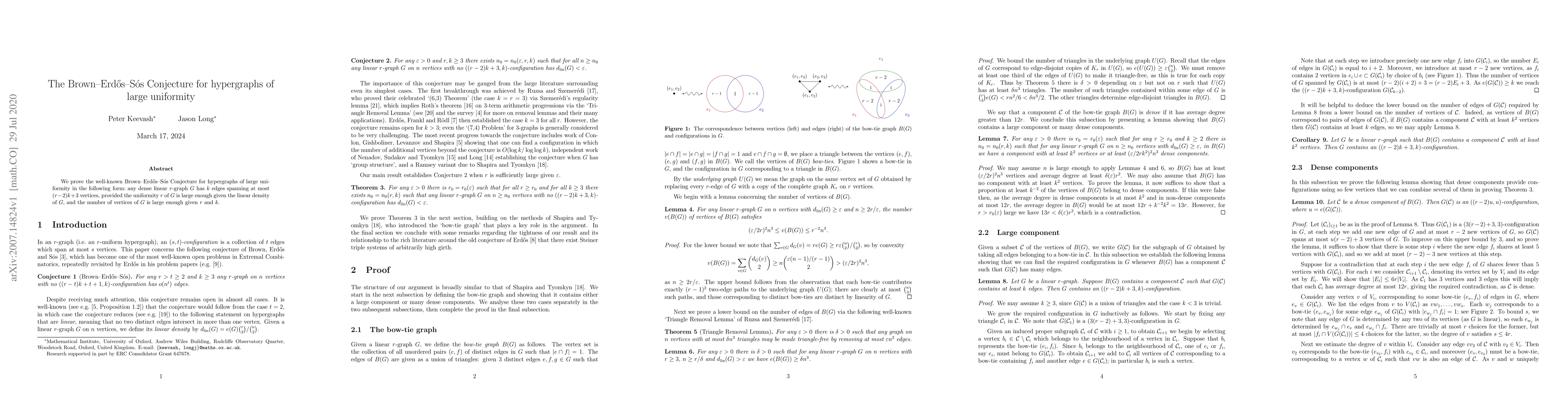 The Brown-Erdős-Sós Conjecture for hypergraphs of large uniformity is proven: any dense linear $r$-graph $G$ with sufficient uniformity and a large enough number of vertices has $k$ edges spanning at most $(r-2)k+3$ vertices.