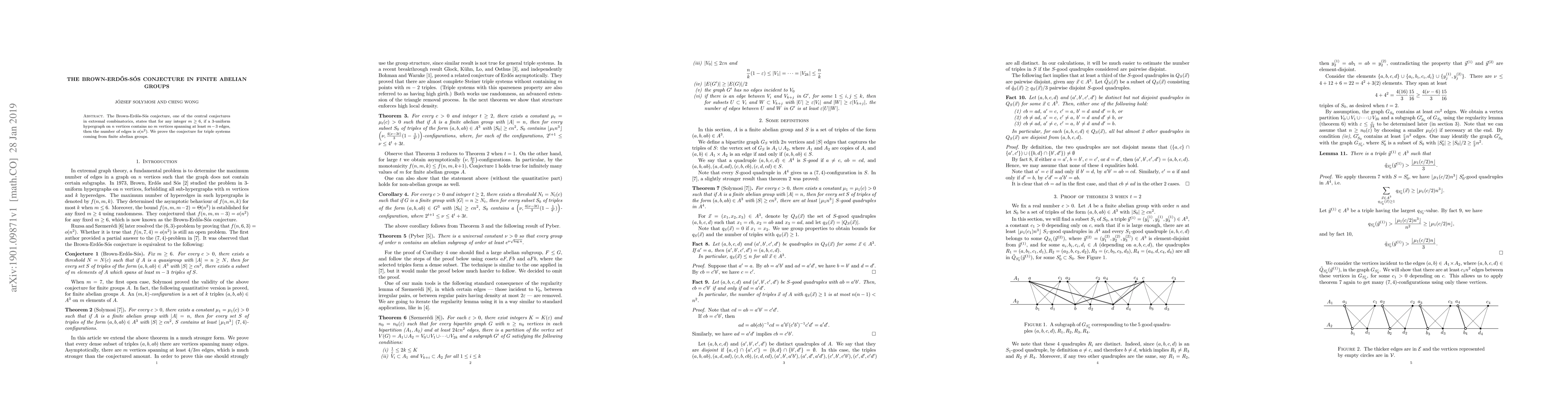 The Brown-Erdős-Sós conjecture posits that a 3-uniform hypergraph with no $m$ vertices spanning at least $m-3$ edges has $o(n^2)$ edges. The paper proves this conjecture for triple systems derived from finite abelian groups.
