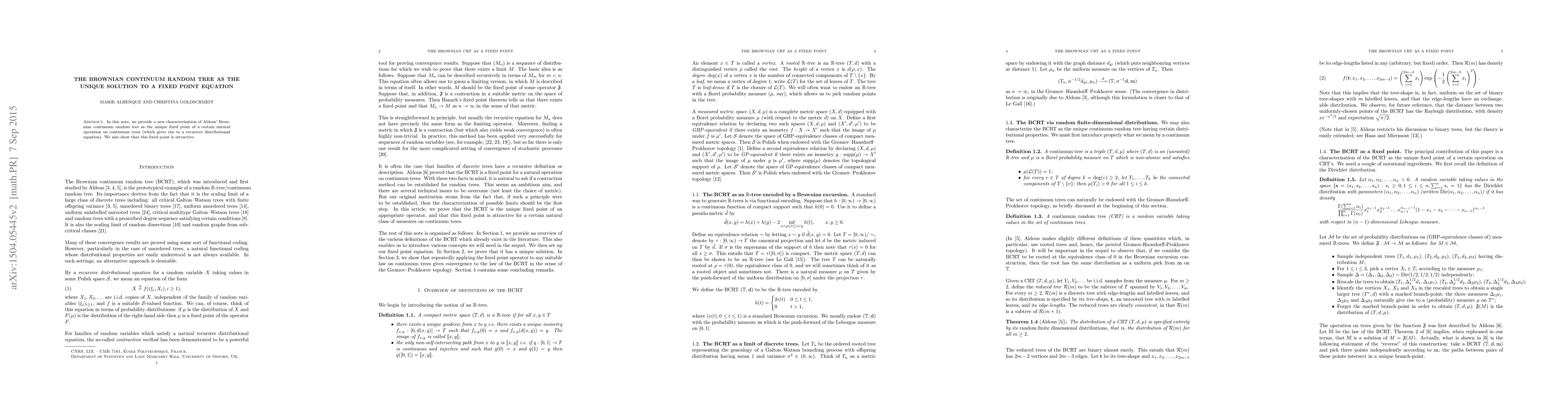Summary: This paper characterizes Aldous' Brownian continuum random tree as the unique fixed point of a specific operation on continuum trees, establishing its recursive distributional nature and demonstrating its attractive property.